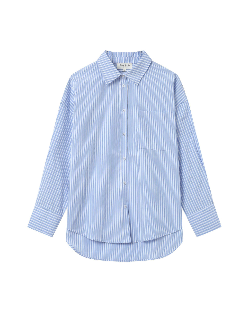 Product details: - 100% cotton striped shirt - Relaxed fit - Long sleeves with buttoned cuffs - Shirt collar - Button fastening at the front - Square patch pocket on the front - Pleat details at the cuffs and back yoke - Exclusive "Grace" embroidery hidden inside the button placket - Rounded hem Sizing advice : Take your regular size. Available from XS to XL to suit all women's curves. Our model is around 172 cm tall, has a waist of 60cm, hips of 87cm and is wearing a size S.