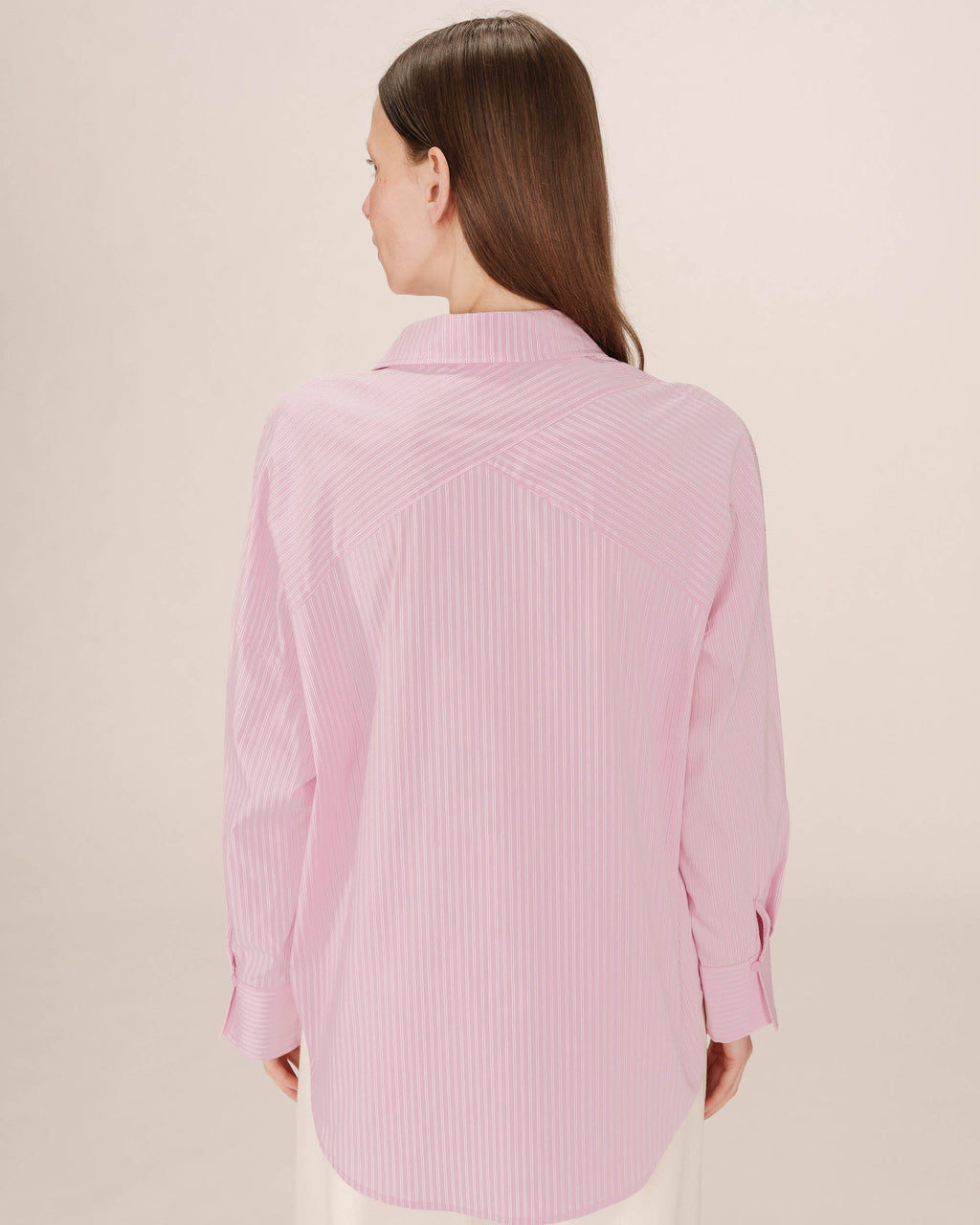STORM_FW2517006_CRISTAL ROSE The STORM striped shirt is a relaxed yet elegant piece. The crossed yoke at the back adds a sophisticated touch and subtle volume. The long sleeves with wide buttoned cuffs create a chic and structured silhouette. The STORM long-sleeved shirt is a casual essential for your everyday wardrobe.