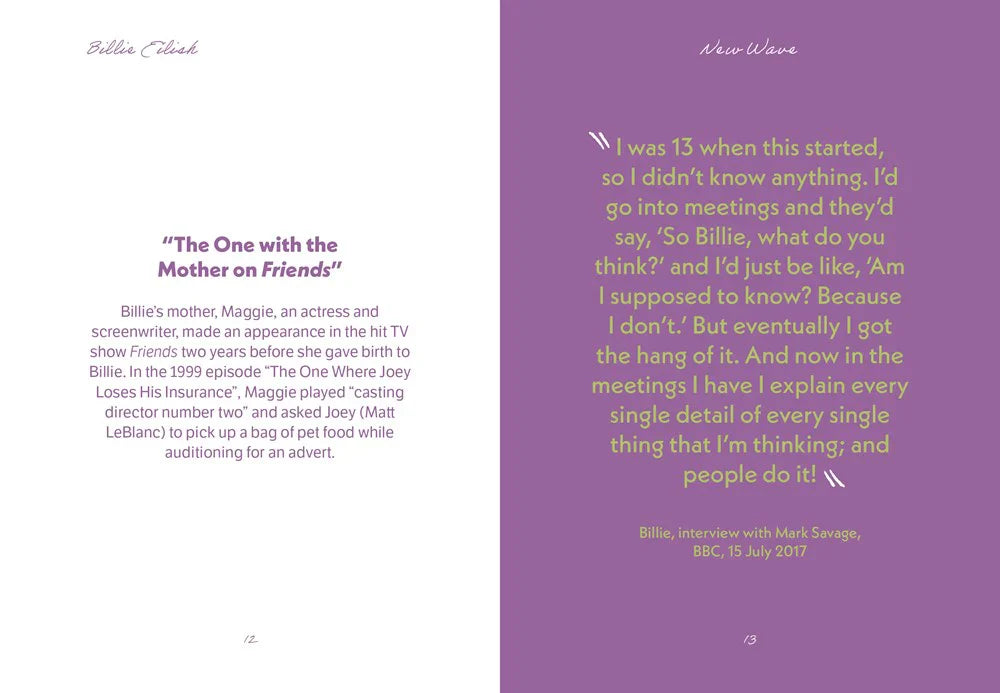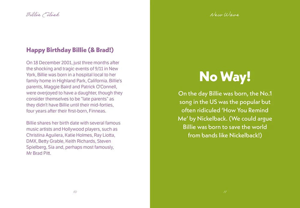 The Pocket Billie Eilish is an unofficial and unauthorized celebration of a totally original talent. It’s packed with facts, trivia, quotes and anecdotes and gives readers an inside look at Billie’s creative process with her brother Finneas, the stories behind her songs, her life at home and in the spotlight, and her unique style, musically and sartorially.