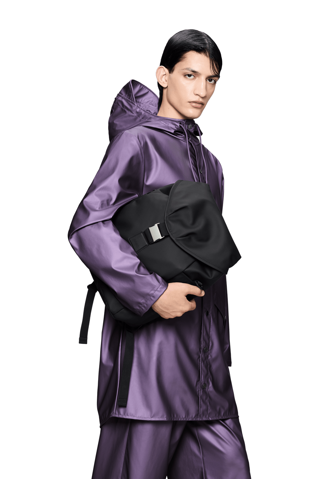 Valera Bucket Backpack is cut from Rains’ signature PU fabric with coating on a softer backside.