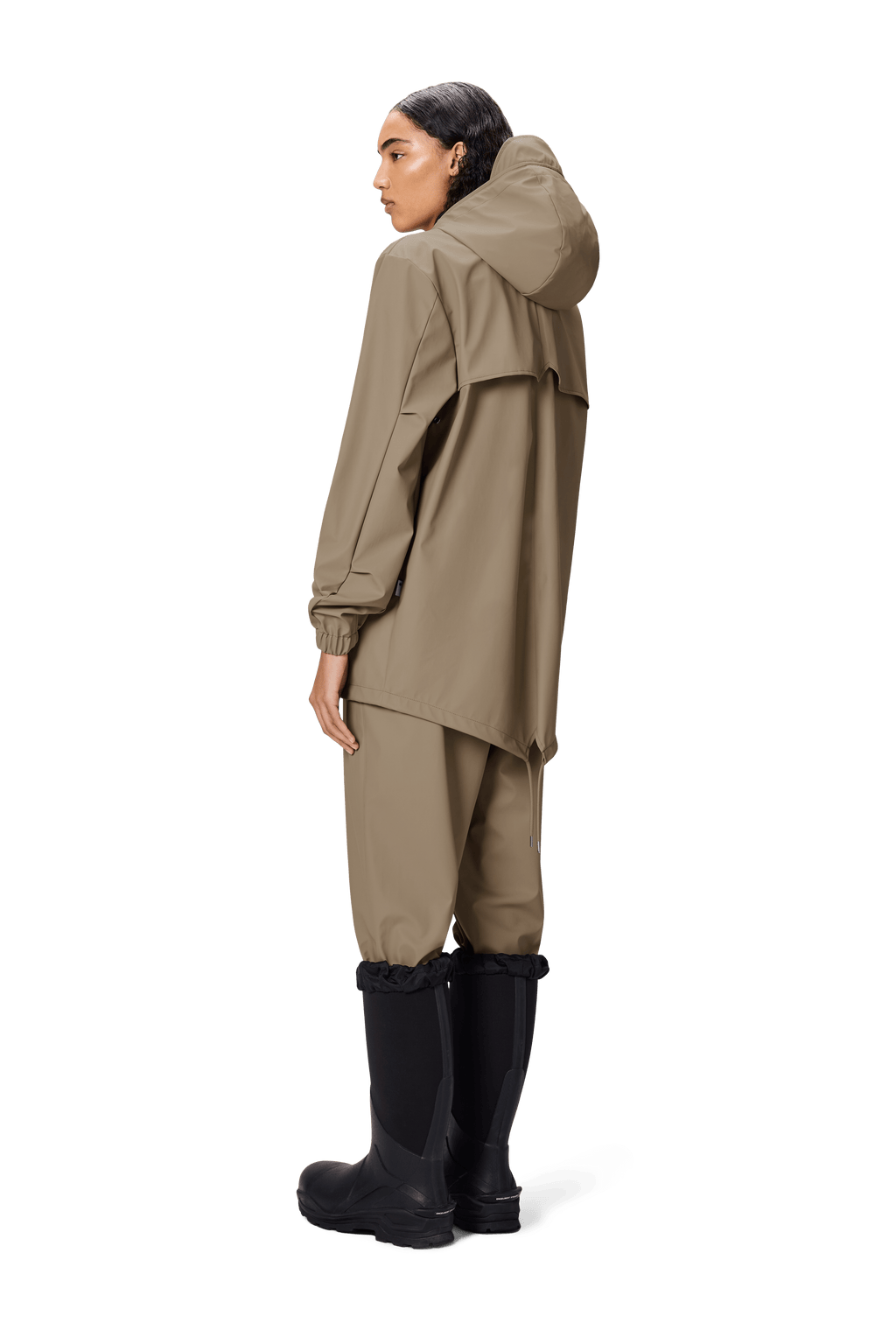 Fishtail Jacket is a unisex raincoat. Characterized by its pared-back aesthetic and drawstring fishtail hem.
