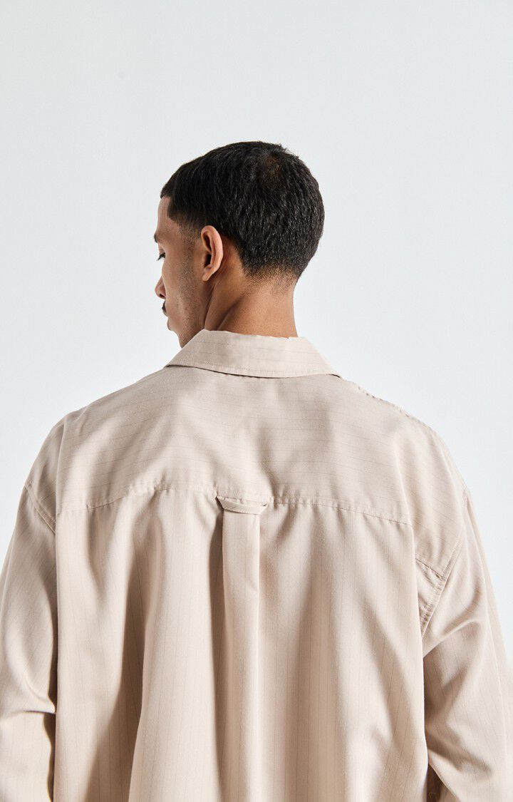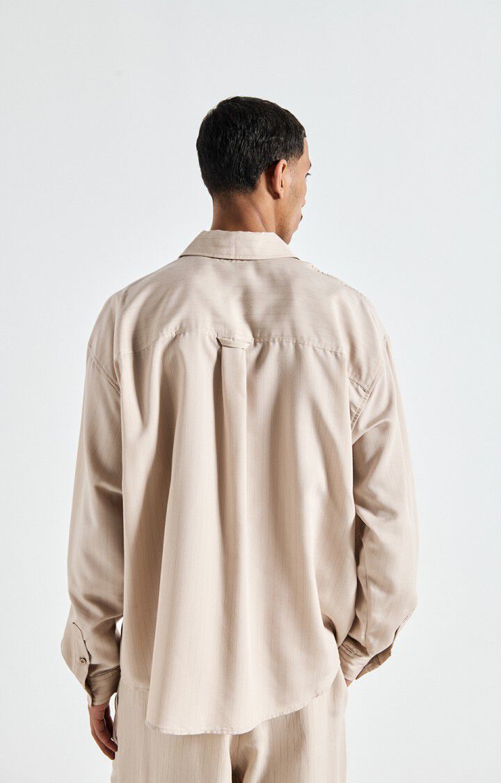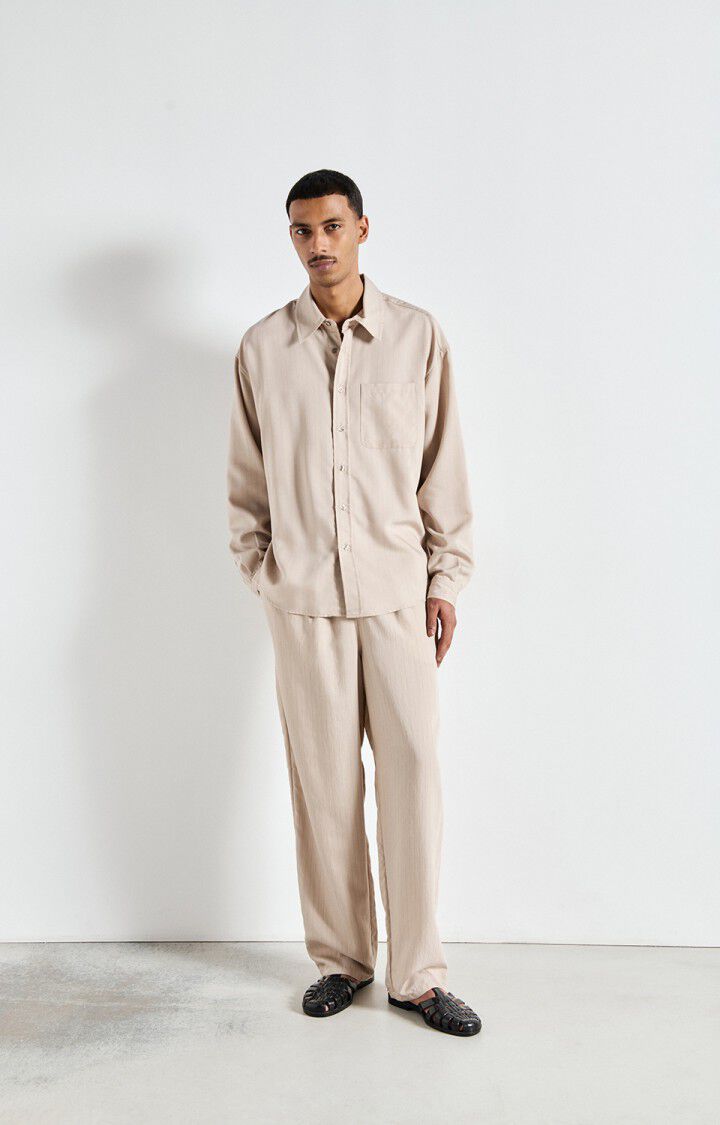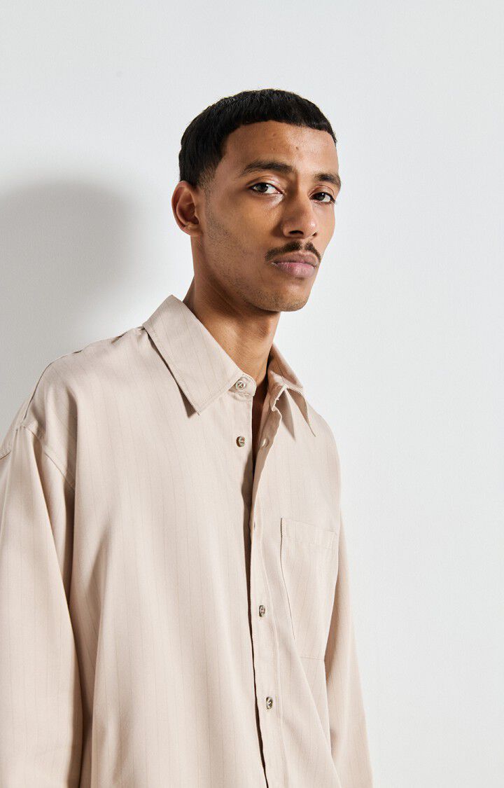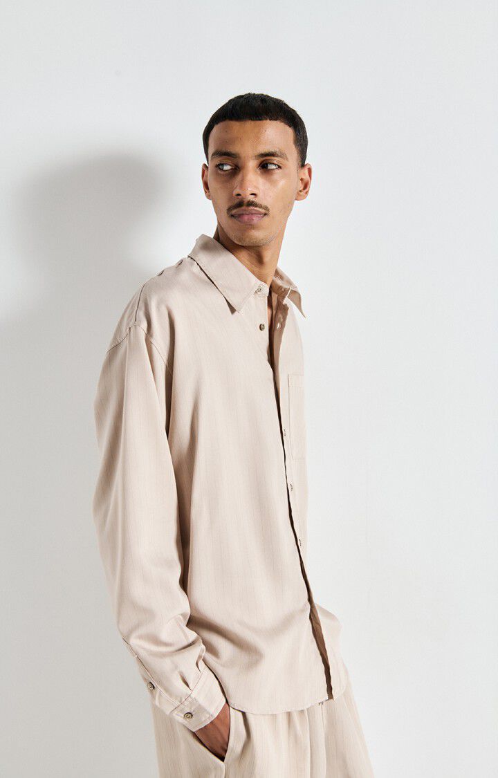 The Okyrow men's shirt offers a light and casual suit look for warmer weather. Made from a fluid fabric with a visually appealing woven pinstripe pattern, it brightens up your outfit while adding a touch of style. It pairs easily with a short-sleeved t-shirt underneath and straight-leg jeans for a relaxed, urban look.