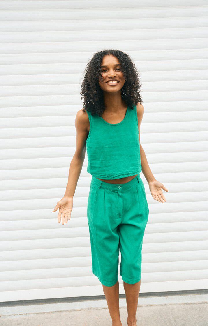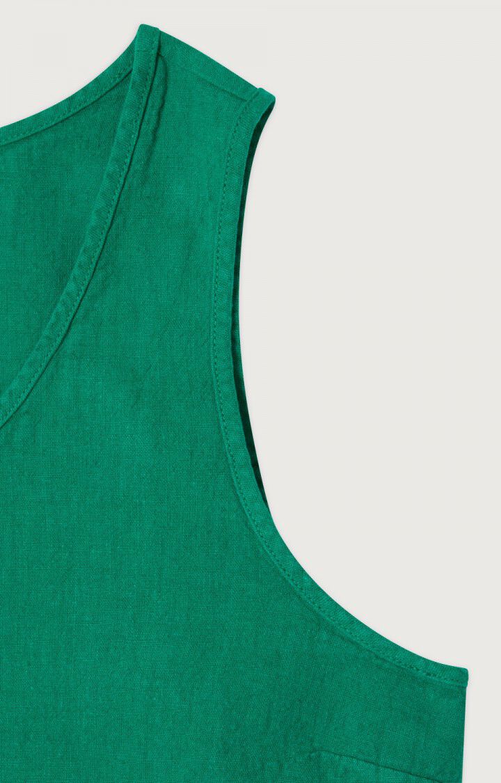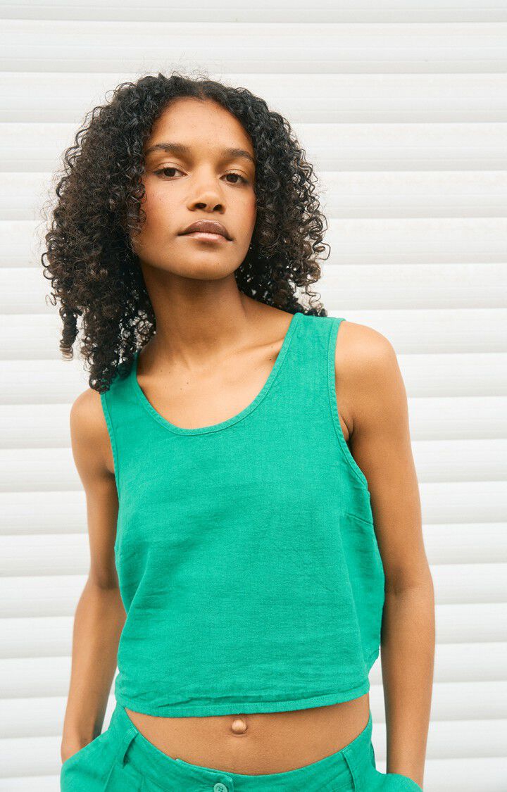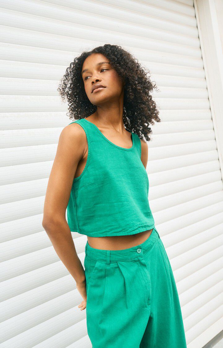 The Toyabay top features a short, sleeveless cut, accentuated by a clean, round neck. Crafted from authentic linen with a dry, compact feel, it offers a structured silhouette while remaining lightweight and comfortable. An essential piece for a city look, ideal for warmer weather.