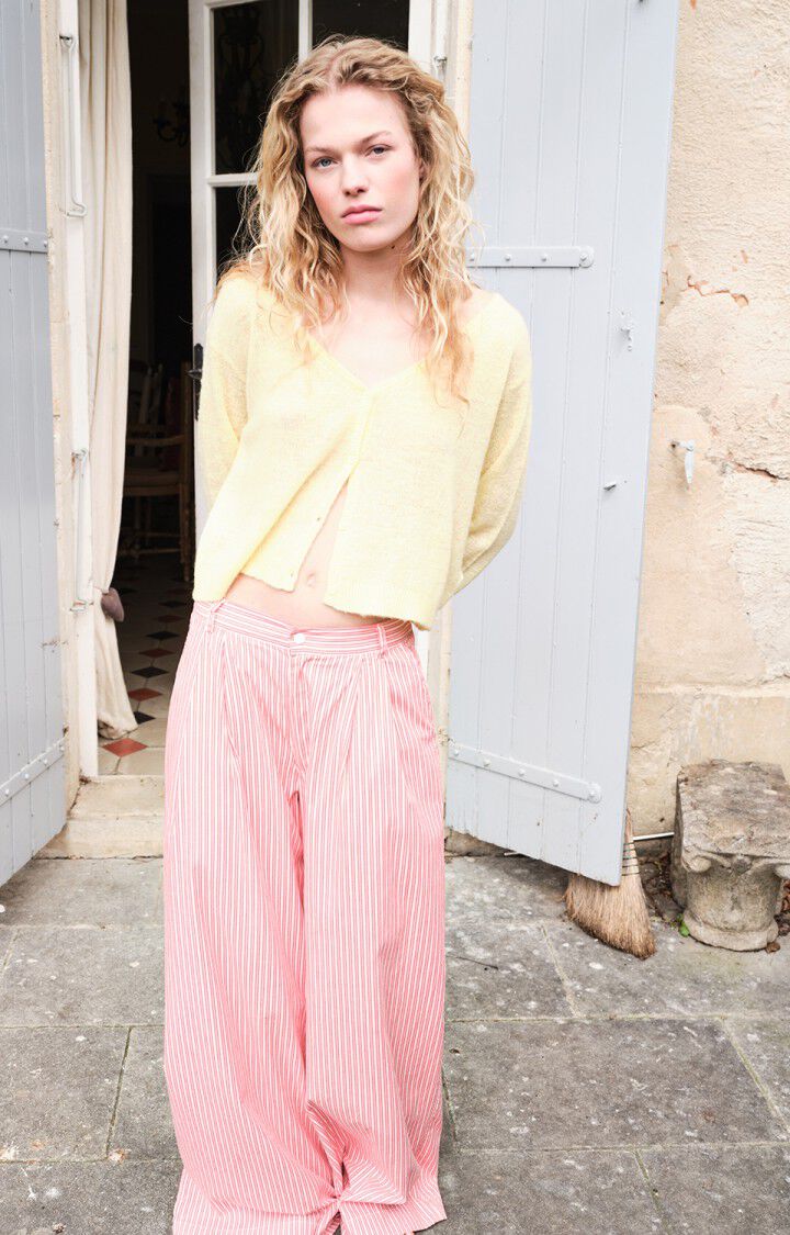 Embrace the Ryfir high-waisted flared trousers, a must-have summer piece. The woven stripes offer a refined visual effect, while the opaque cotton ensures comfort and lightness. Its wide cut, inspired by summer tailoring, visually elongates the legs with its flowing silhouette. A fresh essential to elevate your seasonal looks.