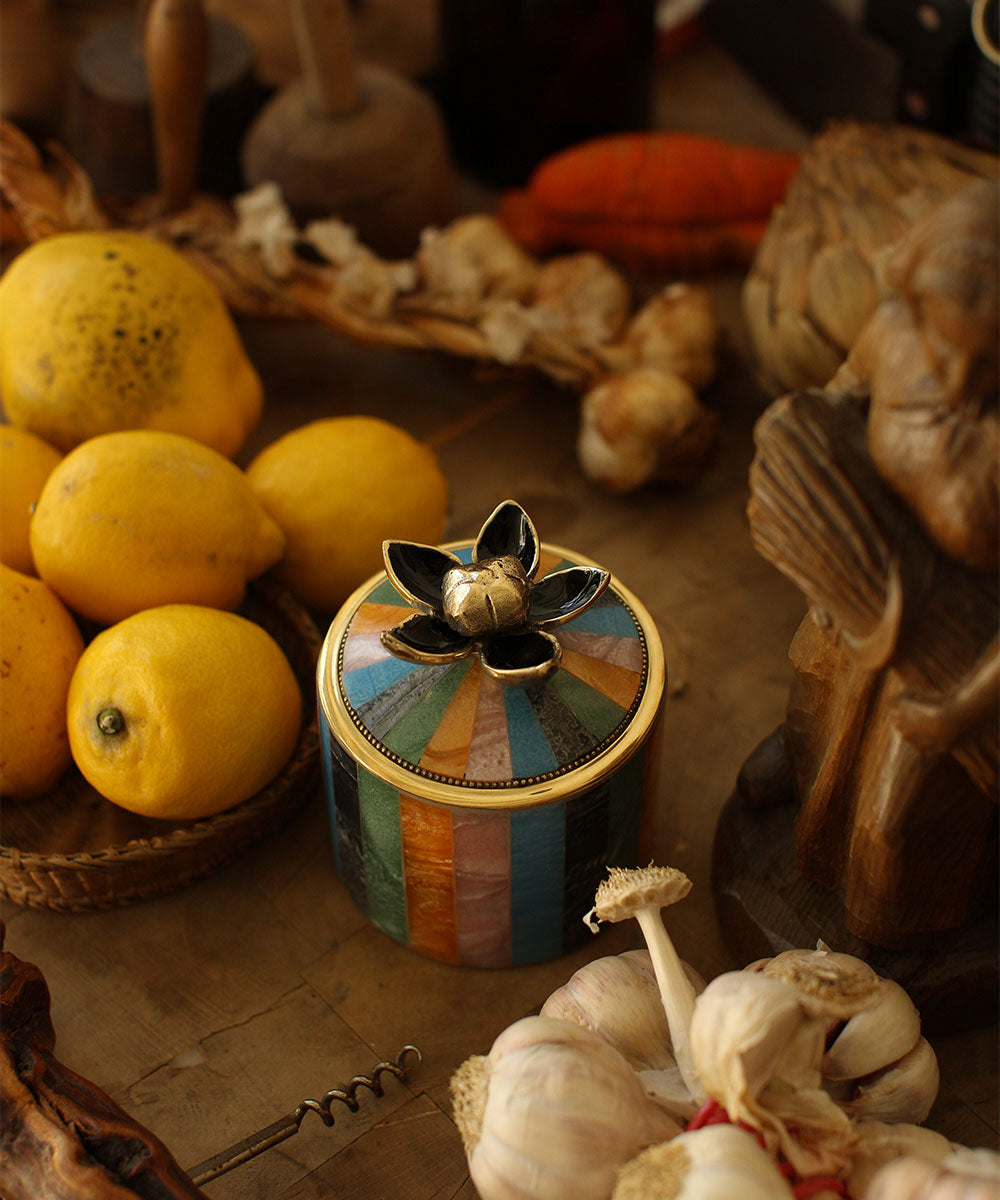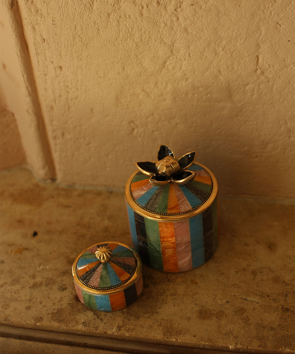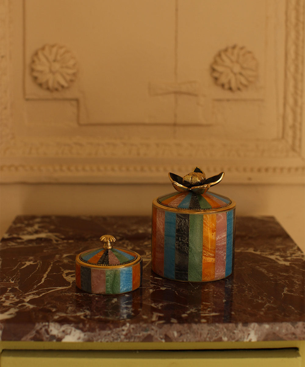 Add a touch of vibrant charm to your interior with the Liv Circus Box Large Multi. This striking storage box is handcrafted from a mix of 60% recycled brass and 40% durable resin. Its colorful striped design and bold flower-shaped lid make it both decorative and functional — a true statement piece on any shelf, dresser, or desk.
