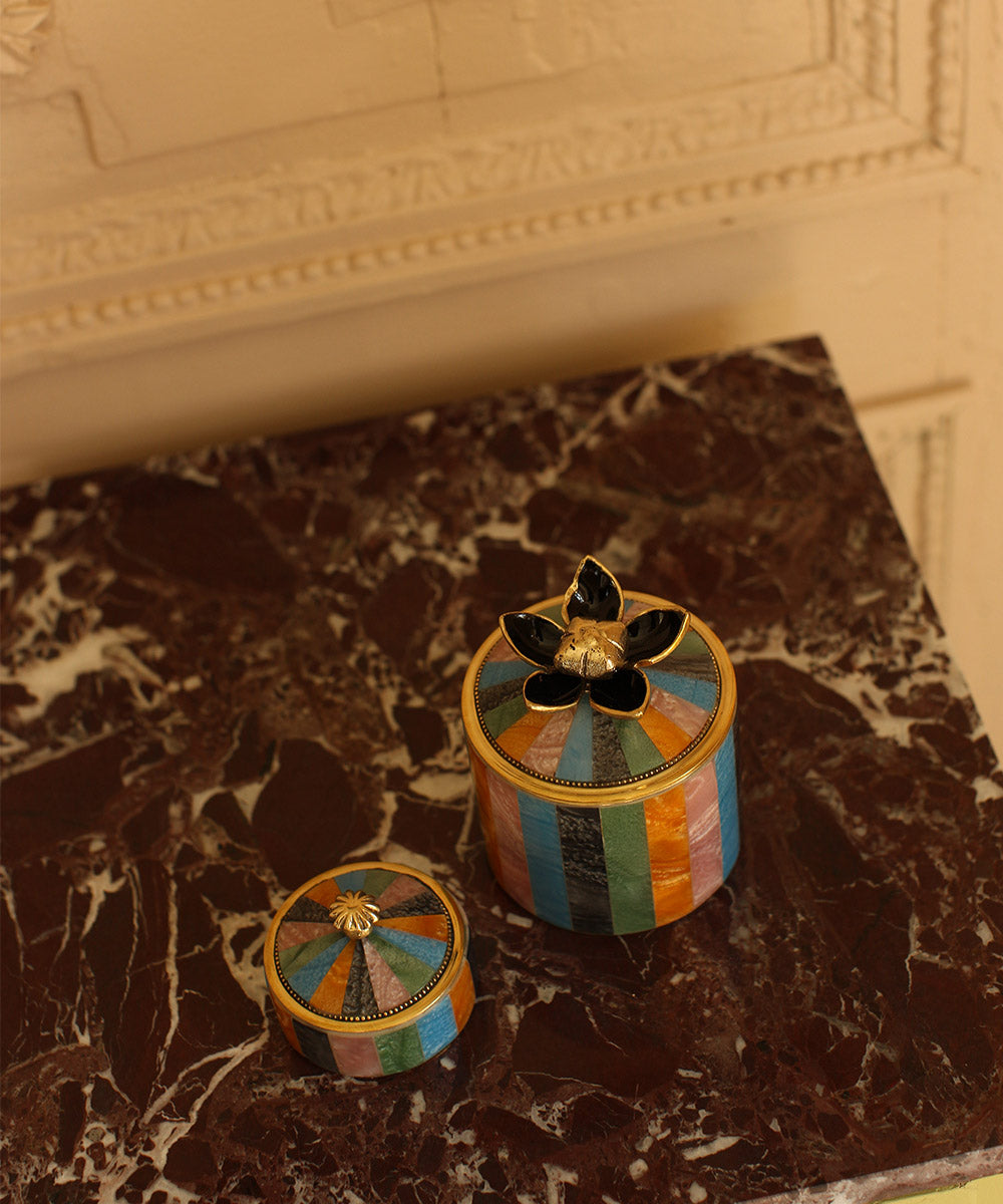 The Piper Circus Box Medium Multi is an enchanting and colourful storage accessory that brings a playful, stylish touch to your interior. Made from 60% recycled brass and 40% resin, this jewellery box combines sustainability with handcrafted charm.