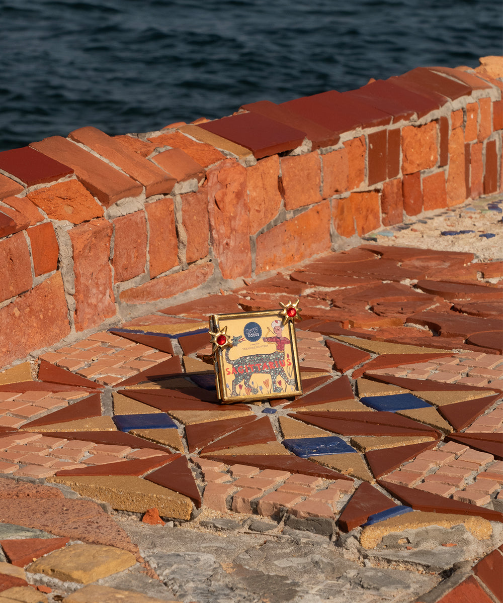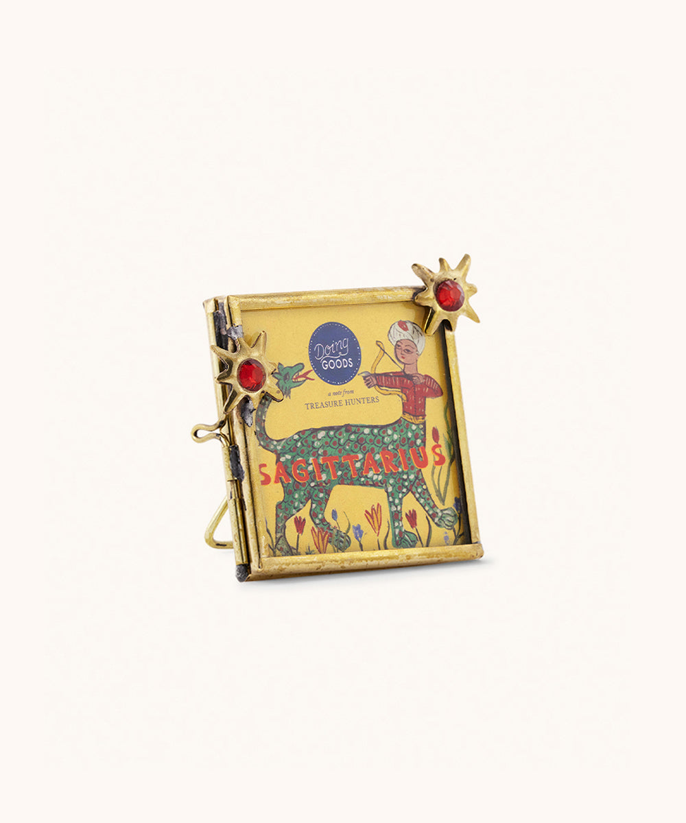 Embark on a journey with the Sagittarius Zodiac Mini Picture Frame, capturing the essence of the adventurous Sagittarius (November 22 - December 21). We meticulously designed this recycled brass frame to feature the iconic archer amidst a backdrop of lush, verdant motifs, with radiant colored stars enhancing its vibrant aesthetic. This frame is not only a nod to the explorer's soul inherent in every Sagittarius but also serves as a sustainable piece of art, perfect for gifting or adorning your own free-spirited space. It's a celebration of the Sagittarian's quest for knowledge and the great outdoors.