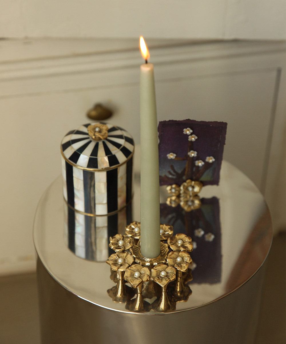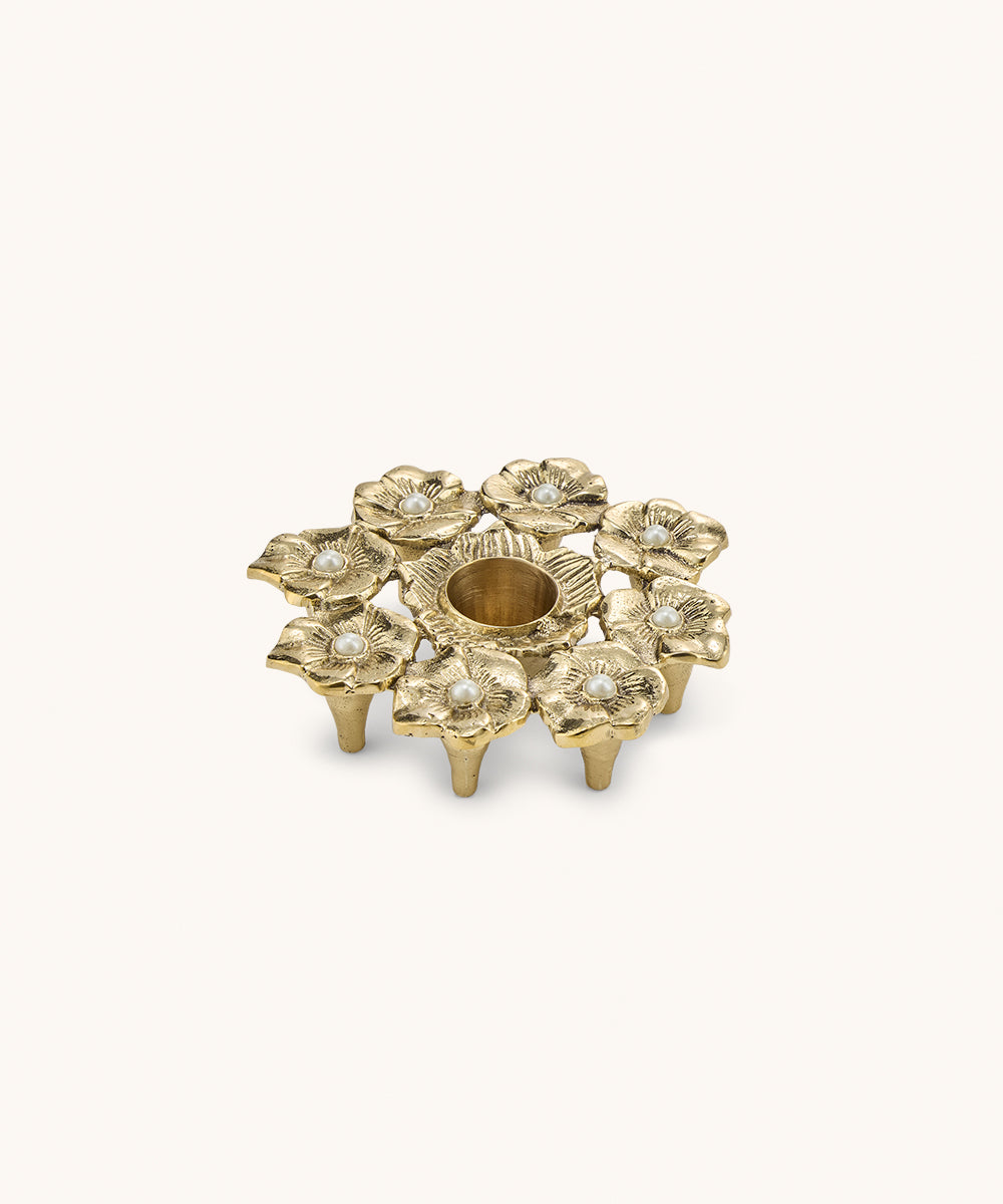 Add a touch of vintage charm and elegance to your home with the Zoey Flower Candle Holder. This beautifully handcrafted piece is made of solid brass and shaped like a blooming flower bouquet, each flower delicately adorned with a pearlescent center.