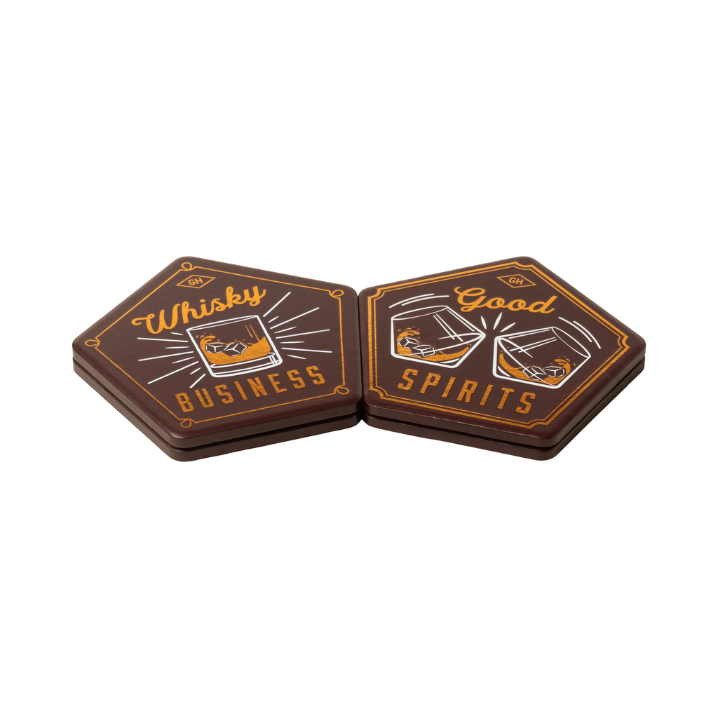 Protect your tabletops and step up your barware with this set of Whisky Coasters, Set of 4 from GentlemenÕs Hardware. These drink coasters come in fun shapes with two creative whisky-themed designs making them playful decor for your bar cart and practical protection during game night. This ceramic coaster set is a great gift for the bartender in your life.
