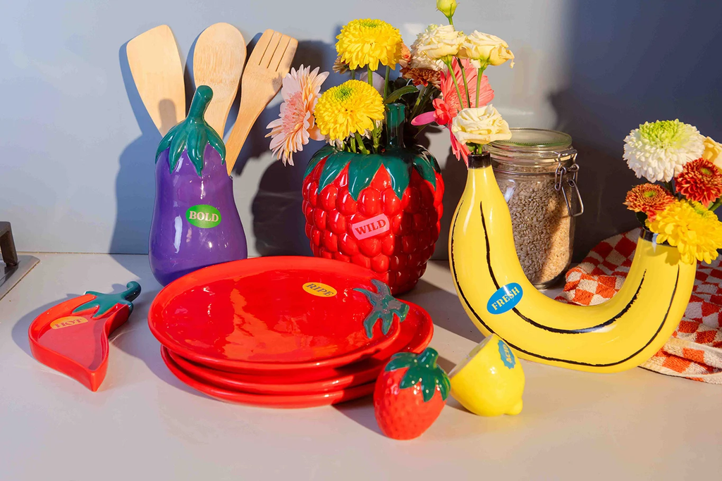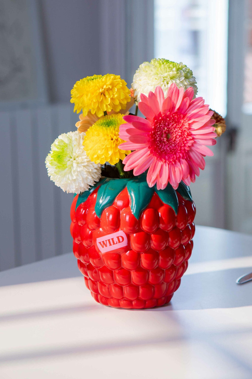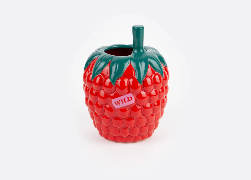 A ceramic vase shaped like a raspberry exudes the lively essence of a farmer's market with its vibrant and stunning allure.