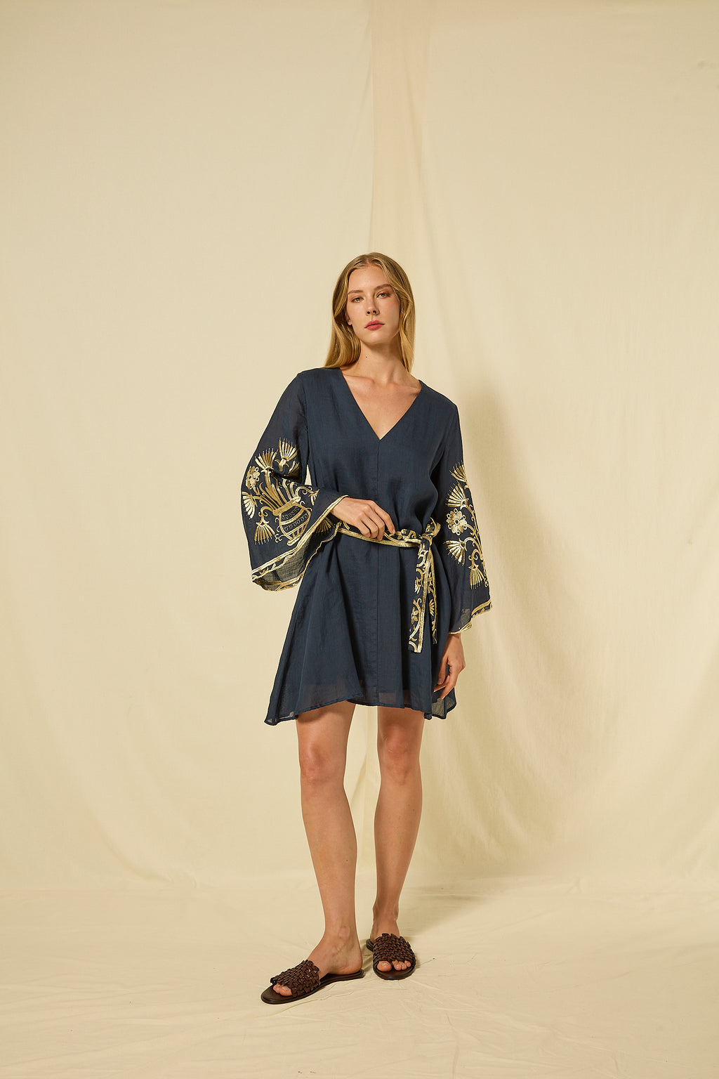 Greek Archaic Kori "Crete" mini dress in A line silouette enhanced by a V neckline and bell sleeves that feature a decorative hem border embroidered with stylized florals and classical vessel motifs.