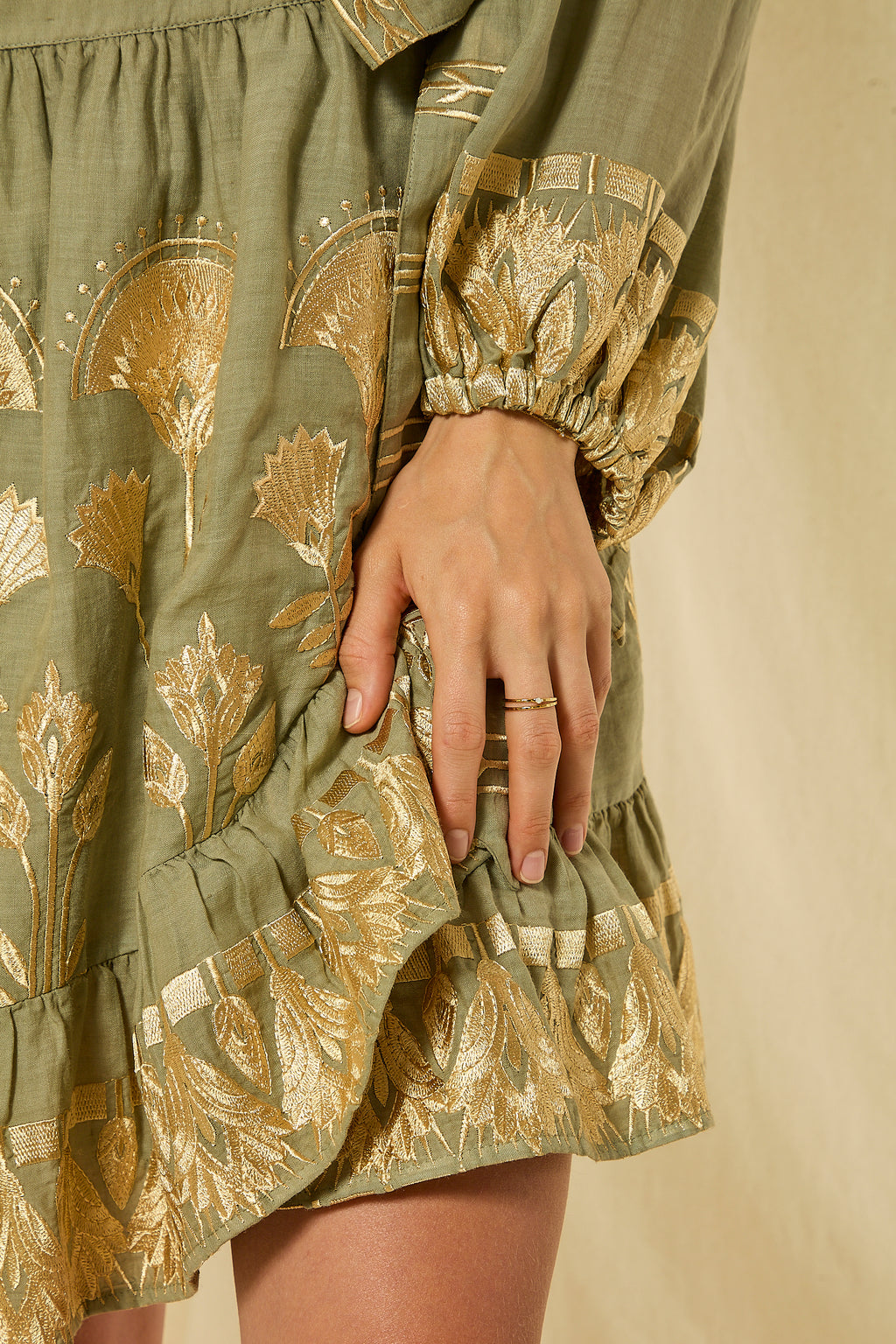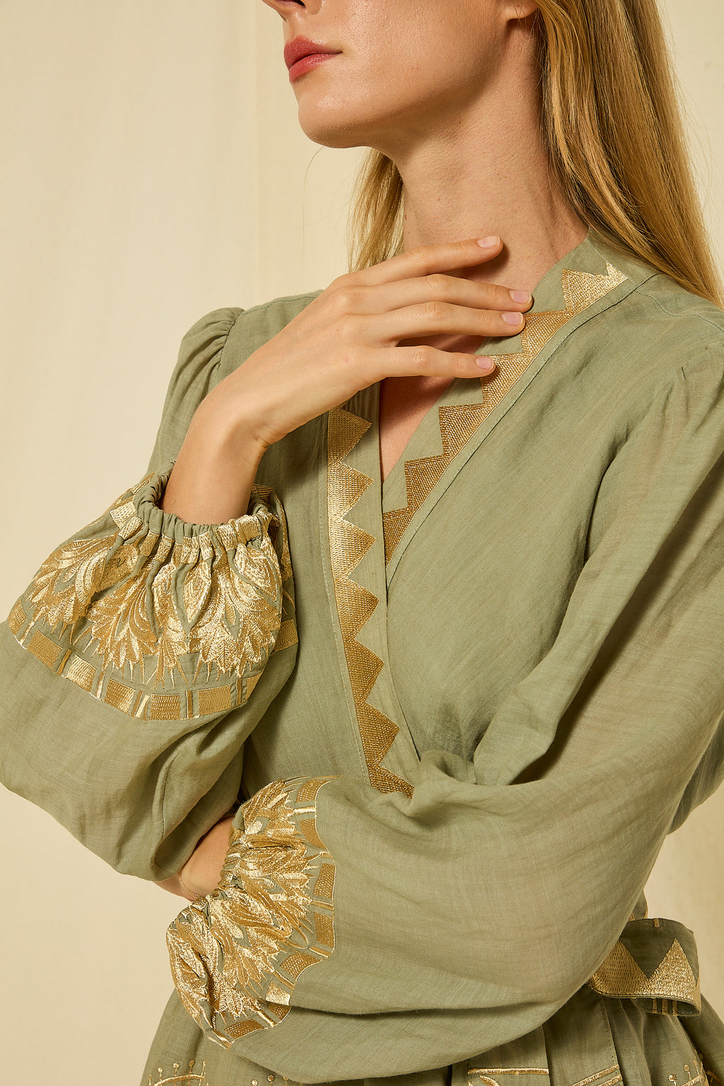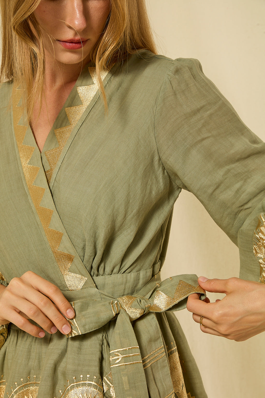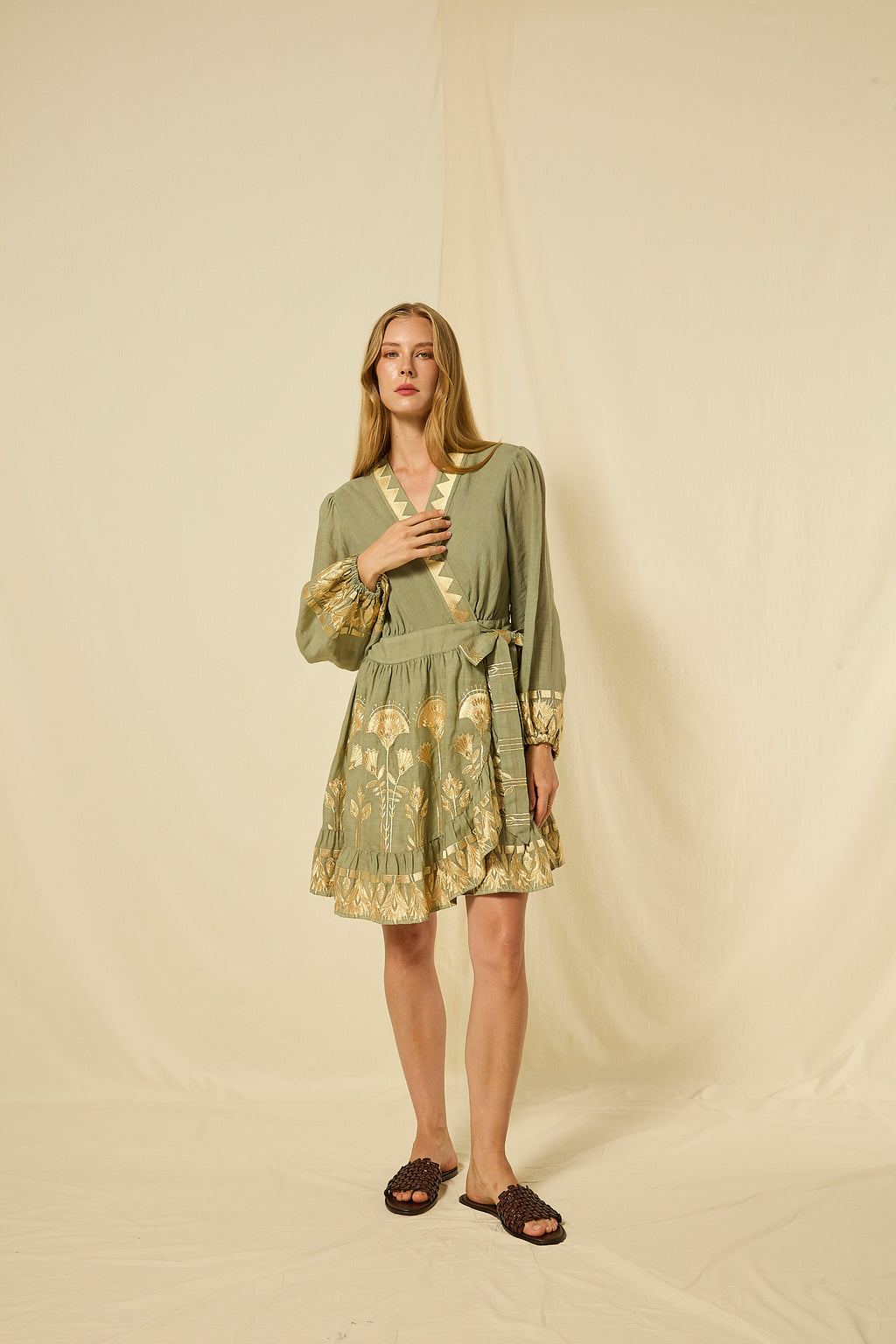 DRESS MINI PAPYRUS WRAP L/S - SAGE/GOLD