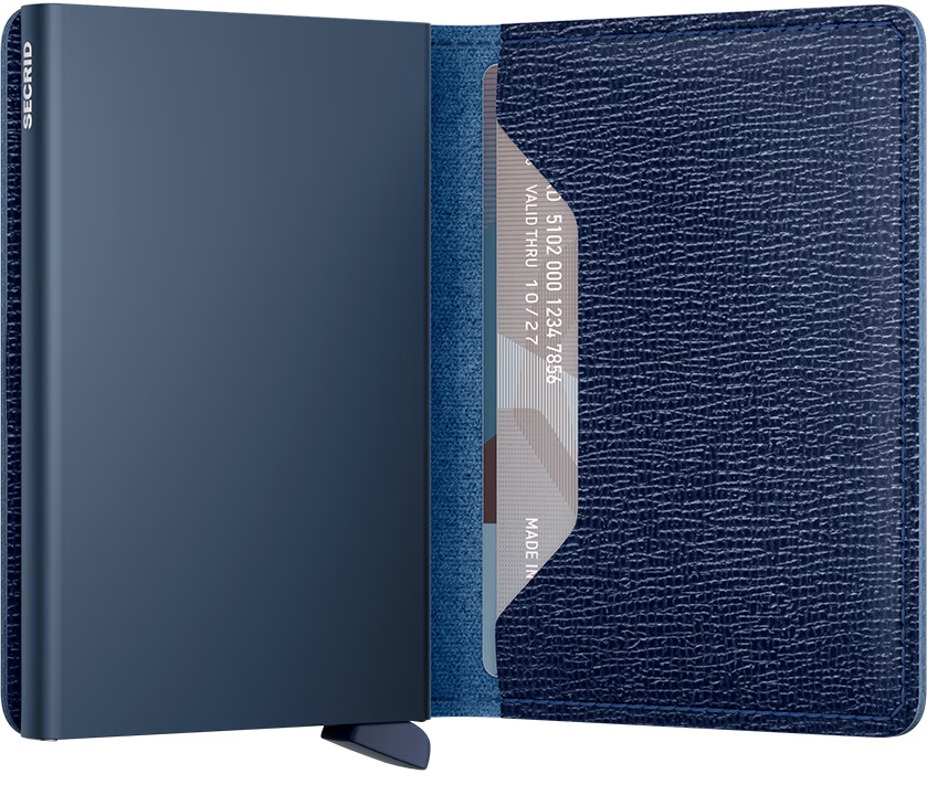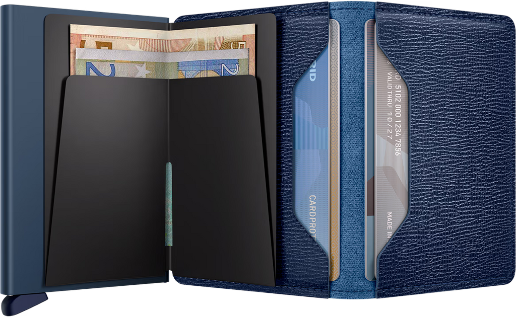 Its slim profile allows the Slimwallet to fit perfectly into any pocket. The open exterior is designed extra wide to accommodate cards, banknotes and receipts. The Cardprotector mechanism enables you to slide out cards with a simple motion, while the aluminium construction protects your cards from bending, breaking and unwanted wireless communication.