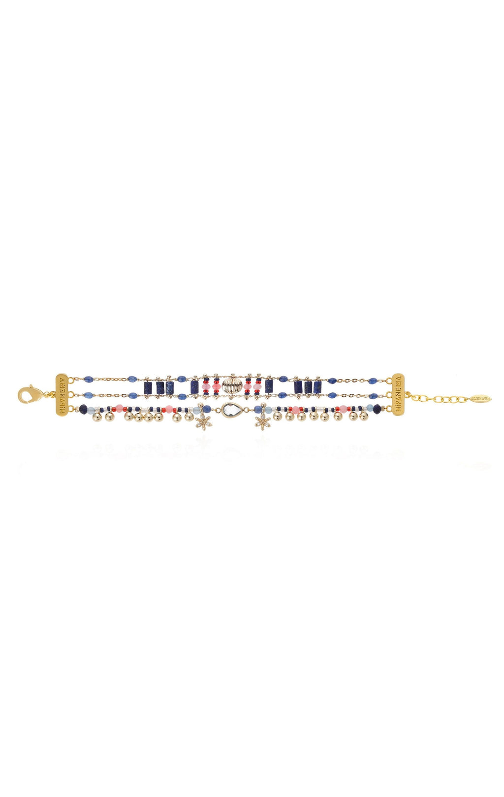 Divine multi-link, the BILBAO bracelet is inspired by the structure of a cuff and consists of three precious, elegant links. The first two, mirrored and linked by a delicate ladder assembly, combine a chapelet chain adorned with lapis-blue faceted beads and tubular pearls that frame a godron-inspired golden pearl in the center. The third link extends the harmony of the first two with a set of pearls in matching hues, embellished with meticulous tassels that sway lightly. To complete the refined balance of this jewel, a cabochon with irregular contours and a montana blue sheen enhances the ensemble, adding a final touch of character and sophistication.