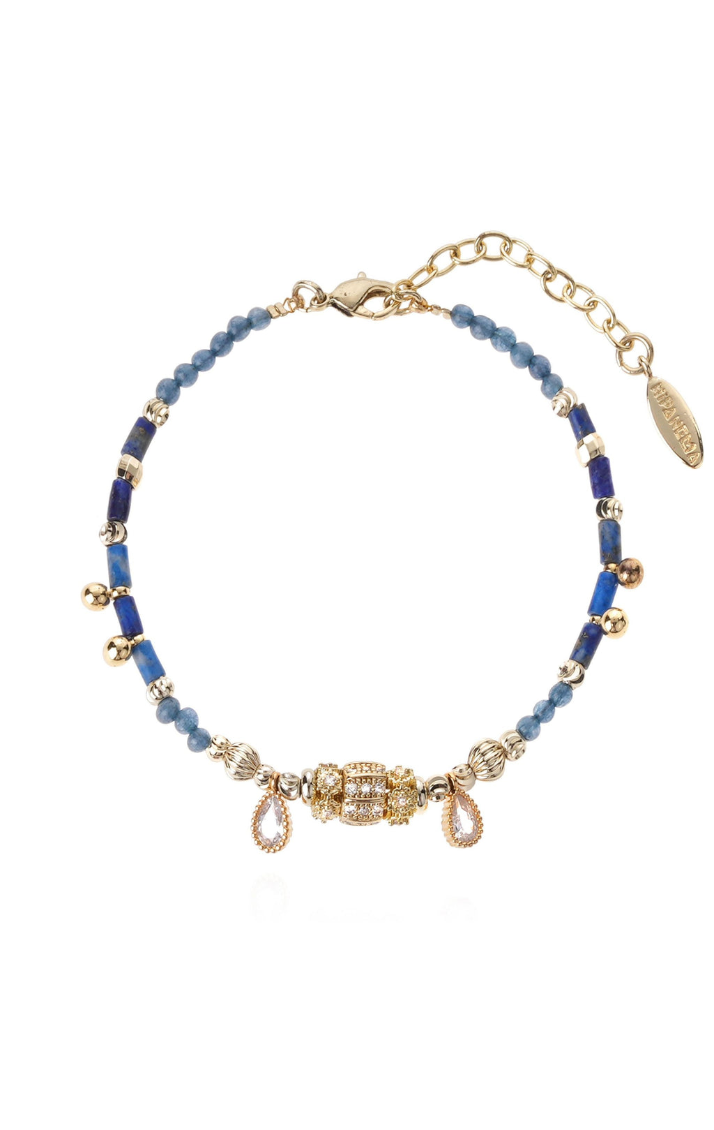 Imagined in a cameo of blues enhanced by a sparkle of rhinestones, the CESARIA bracelet, gilded in 14-carat fine gold, alternates tubular and round pearls in genuine lapis lazuli, as well as small golden beads, bringing the perfect dose of sophistication to this adorable bracelet. In the center, the sequence of pearls, gold rondelles and rhinestones completes the sparkle.