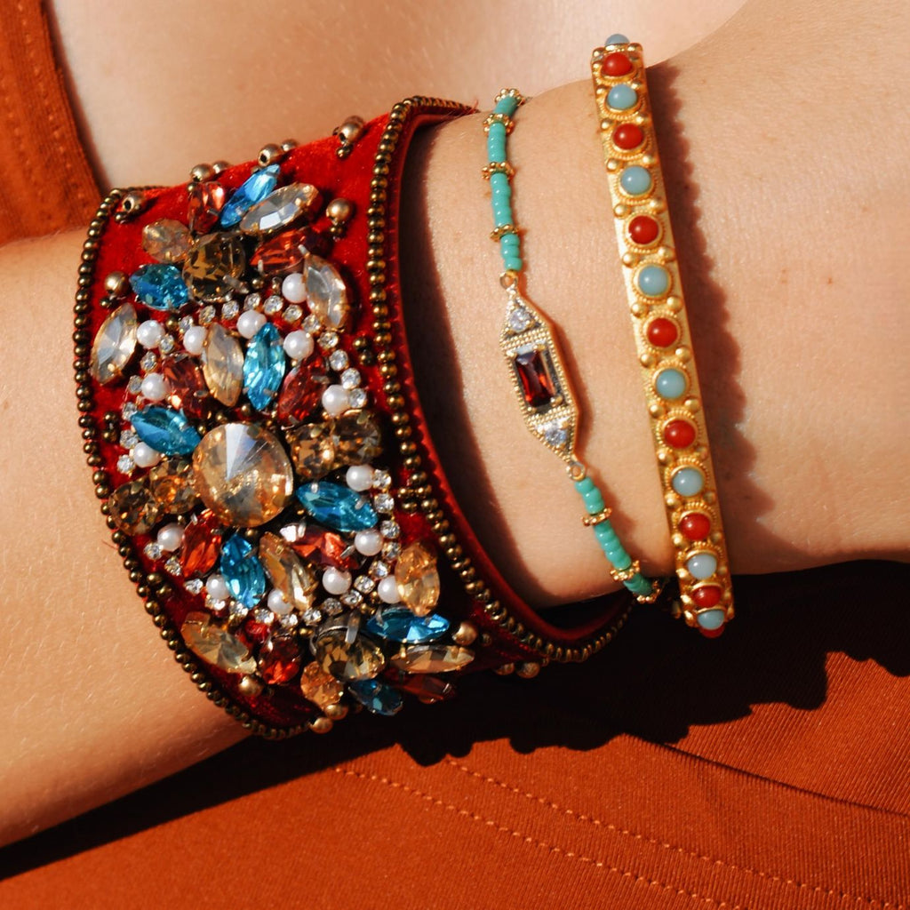 With precious finesse, the SOUDANA bracelet, in 14-carat gold-plated copper, wraps around the wrist with exquisite delicacy, adorned with small turquoise faceted seed beads, interlaced with fine gold rondelles with floral motifs. At its center, a cartouche-shaped cabochon is adorned with a faceted stone with garnet reflections and two diamond-effect rhinestones, giving this piece a refined sparkle. All set in a ball setting, adding the bohemian touch we love so much.