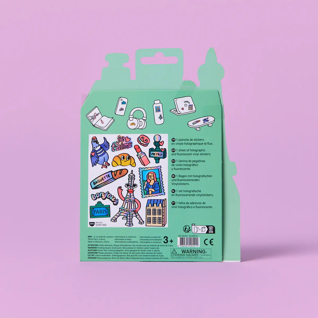 A sticker sheet that captures all the charm of Paris: the Eiffel Tower, the metro, baguette, perfume, macarons, a little “Je t’aime,” “Bonjour”… and even the Mona Lisa!