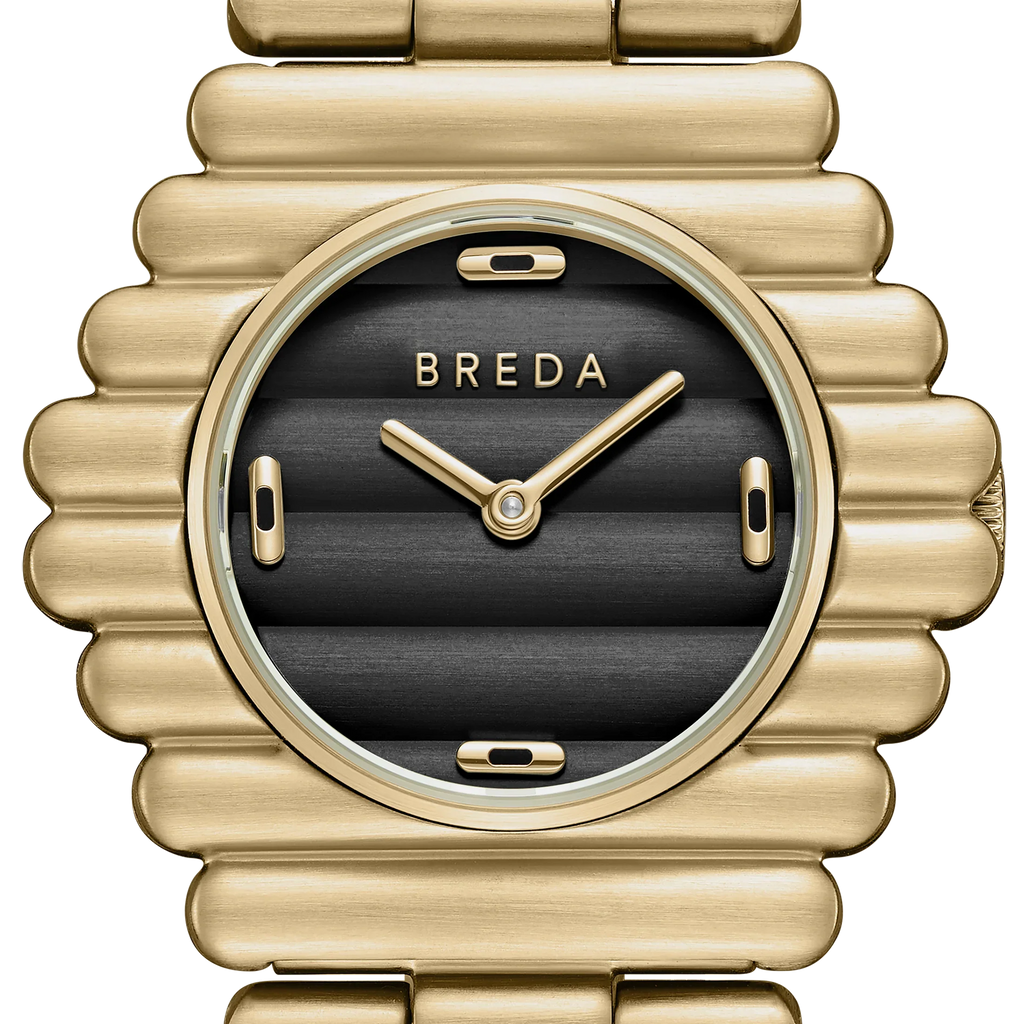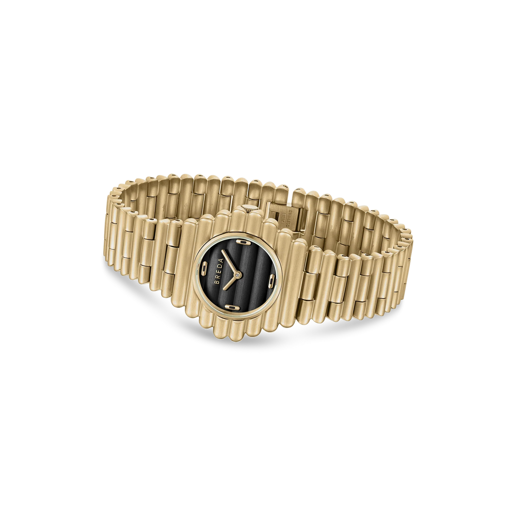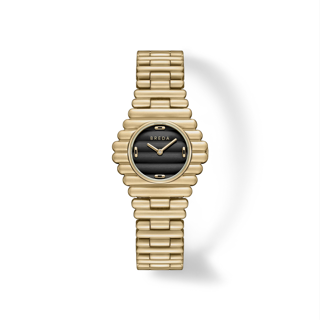 The Coda in Gold/Midnight celebrates closure as an act of growth. With a silhouette composed of continuous curvature, made stainless steel, that tapers from the 32mm case to the 19mm bracelet, Coda carries a sense of harmony with time. The uninterrupted capsule shape design featured seamlessly through the timepiece creates a subtle yet striking profile around the wrist and fastens with a jewelry clasp. The Midnight dial includes subtly placed gold and black enamel hour markers at cardinal points.