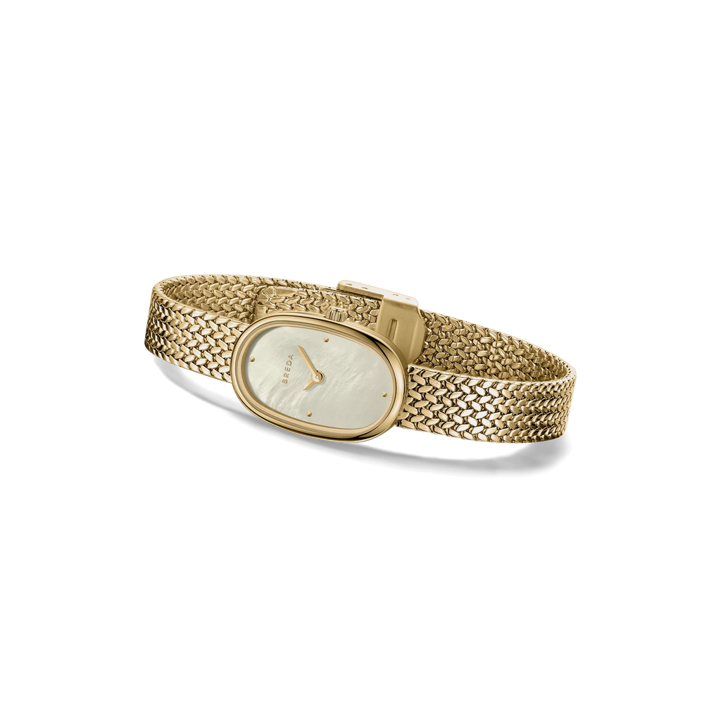 The Tethered Collection exists as a daily reminder of our human connection and our shared memories intertwined, endlessly collapsing together. The Jane (Tethered) Small features a more compact 18mm oval case and is complemented by a champagne mother of pearl dial with a woven mesh bracelet that fastens with a quick release clasp.