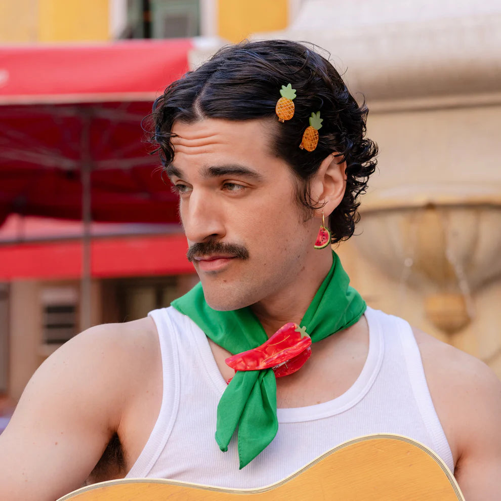 Here we are, dressed in our best country outfits to go on a picnic, but there's one little something missing... The pineapple barrette of course! Just slip one or two into our locks and we're ready to go.