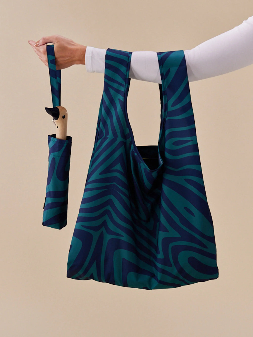 Meet The Extra Bag, originally handmade from the surplus material from our umbrella canopies. Following popular demand, we now recycle 6 plastic bottles to create each one of our reusable bags.