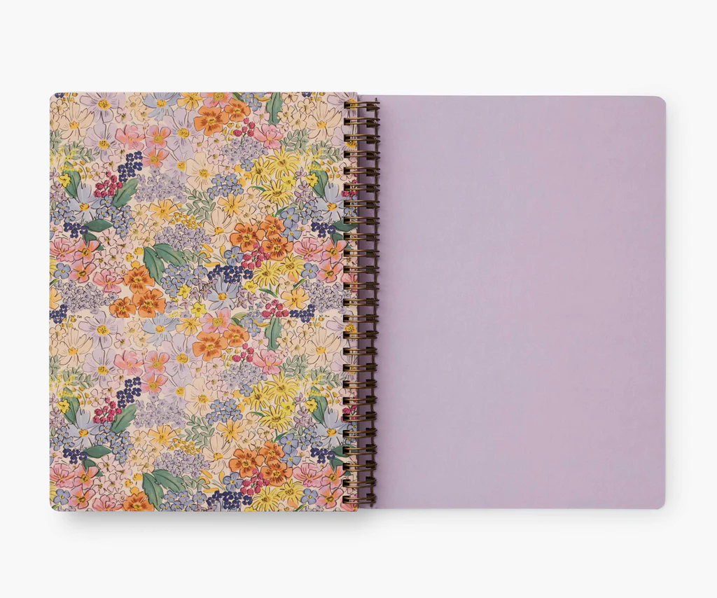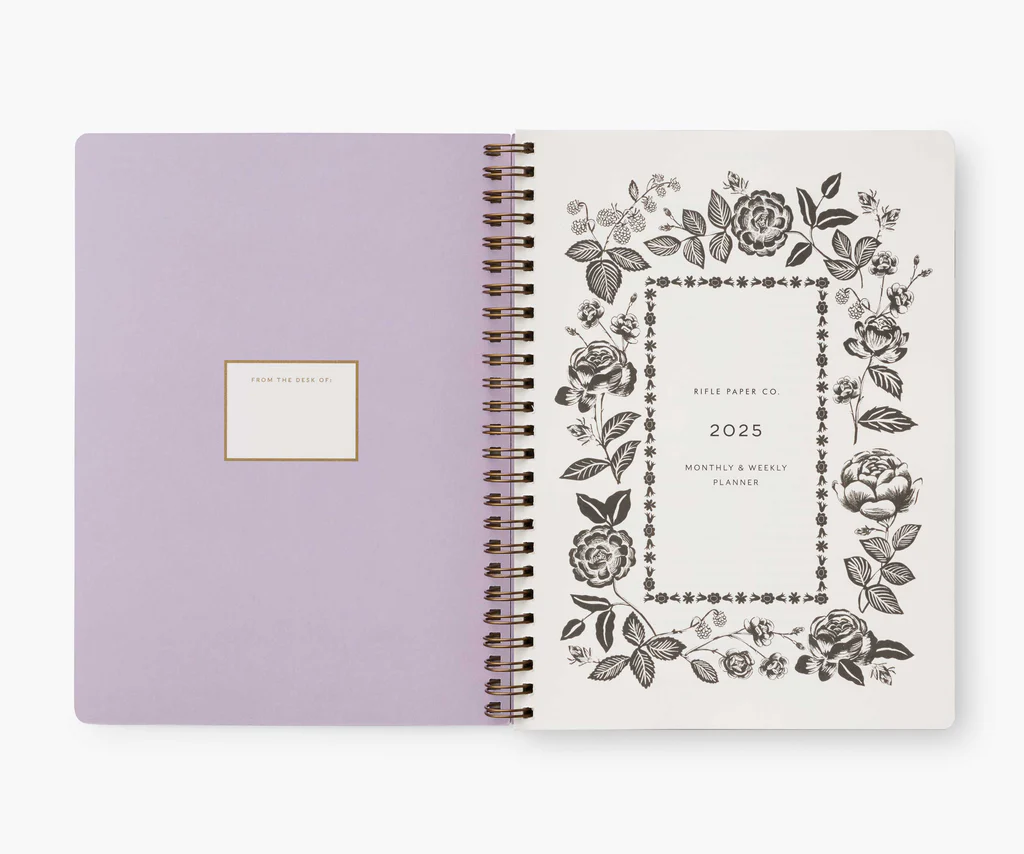 This softcover spiral planner features a textured paper cover with a full-color floral design and a gold foil year. The weekly view includes a full page for notes and lists on every spread. In addition, there are sections for monthly views, contacts, goals, and pockets for storage.