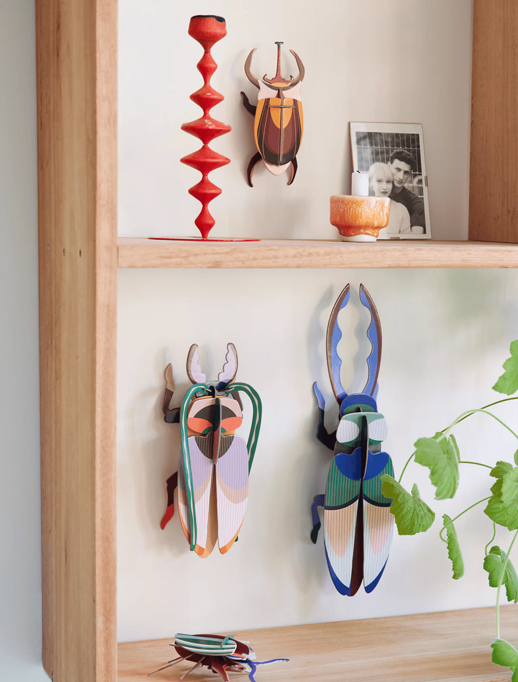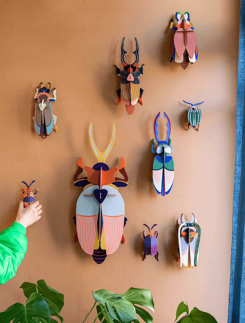 In real animal life, they inconspicuously scuttle about under leaves and on branches, but these flamboyant and colourful beetles – from every corner of the world – look as if they have just stepped off the catwalk. Give them a place among your artistic treasures, hang them on the wall, let them crawl around on your table and create your own insect story.