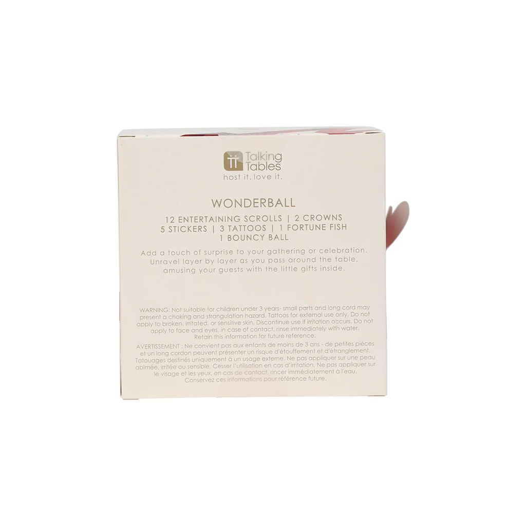 A festive twist on pass the parcel, this Santa-shaped wonderball is packed with laughs, challenges and surprises. Layer by layer, guests unwrap scrolls with jokes, trivia and mini games, plus small treats like stickers, party crowns and tattoos. It’s designed to bring joyful moments to the table — with gifts they’ll remember even after the paper’s gone.