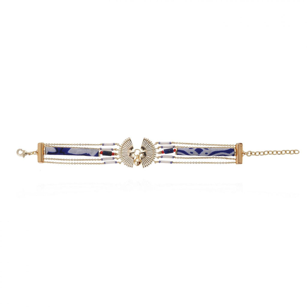 Borrowing its unique charm from exceptional craftsmanship, the SKYLETT bracelet features a twisted bandana fabric, delicately hand-embroidered with small pearls. At its center, two stylized eagles are mirrored and linked by a small bell ring, while their tails unfurl a magnificent array of lapis blue and white tube pearls. An original creation, reflecting HIPANEMA's most emblematic inspirations, that boldly revisits elegance.