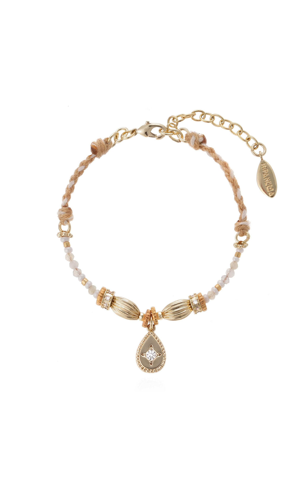 Entirely handmade and marked by exceptional craftsmanship, the ZENIBA bracelet is distinguished by the braided rope that makes it so charming. Available in two colors, the white version features an elegant assemblage of small beads in gray labradorite, ivory white, mother-of-pearl and gold, enhanced by genuine stones in matching tones. In the center, pearls and rondelles in 14-carat fine gold, adorned with diamond-effect rhinestones, lend the ensemble a precious elegance.