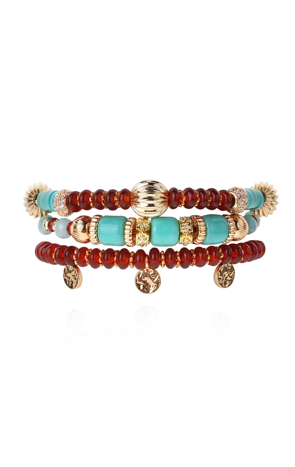 Inspired by the magnificent combination of garnet and turquoise shades that embodies one of the collection's flagship aesthetic lines, the JERBA cuff, equipped with the famous magnet clasp, is made up of three distinct links. The first link, playing on precious irregularity in its volumes, mixes round turquoise-effect pearls, oval garnet-type pearls, as well as sequences of godron-effect balls and rhinestone rondelles. The second link, finely crafted, features amazonite beads and three square turquoise-effect pearls. Finally, the last link is made exclusively of garnet pearls, interspersed with small luminous gold rondelles. A precious, colorful little nugget, ideal for enhancing your wrist all winter long.