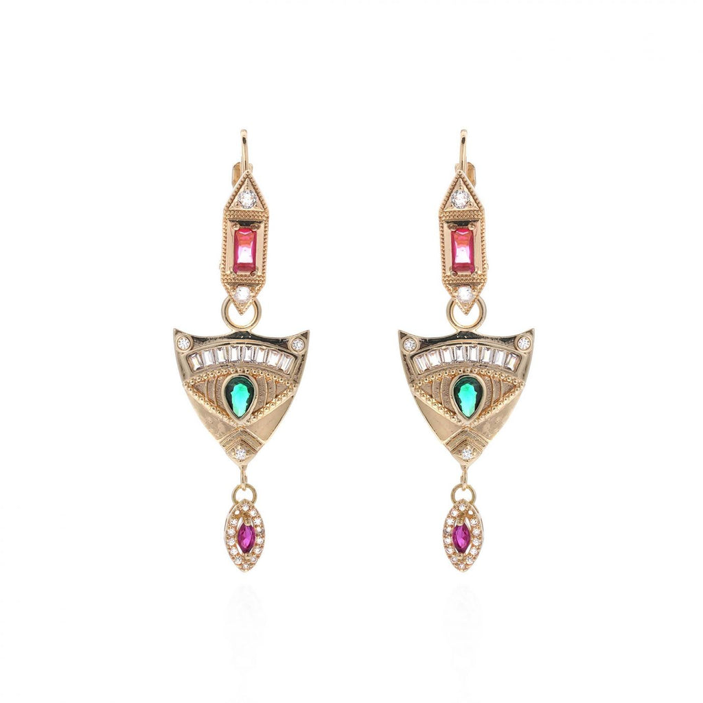 LYVIE earrings, mounted on dormeuses and crafted in fine gold-plated brass, are composed of three distinct parts: a cabochon set at the head of the loop, whose emerald-cut stone sparkles with pink spinel reflections, accented by two diamond-effect rhinestones, one at the top, the other at the bottom. The center of the buckle features a delicately worked arrow with a protective eye. The surrounding emerald-effect stone and baguette rhinestones add a precious touch. Finally, a ruby-effect oval stone tassel, adorned with diamond-effect rhinestones, completes the piece, with its slender shape pointing downwards, underlining the finesse of this jewel.