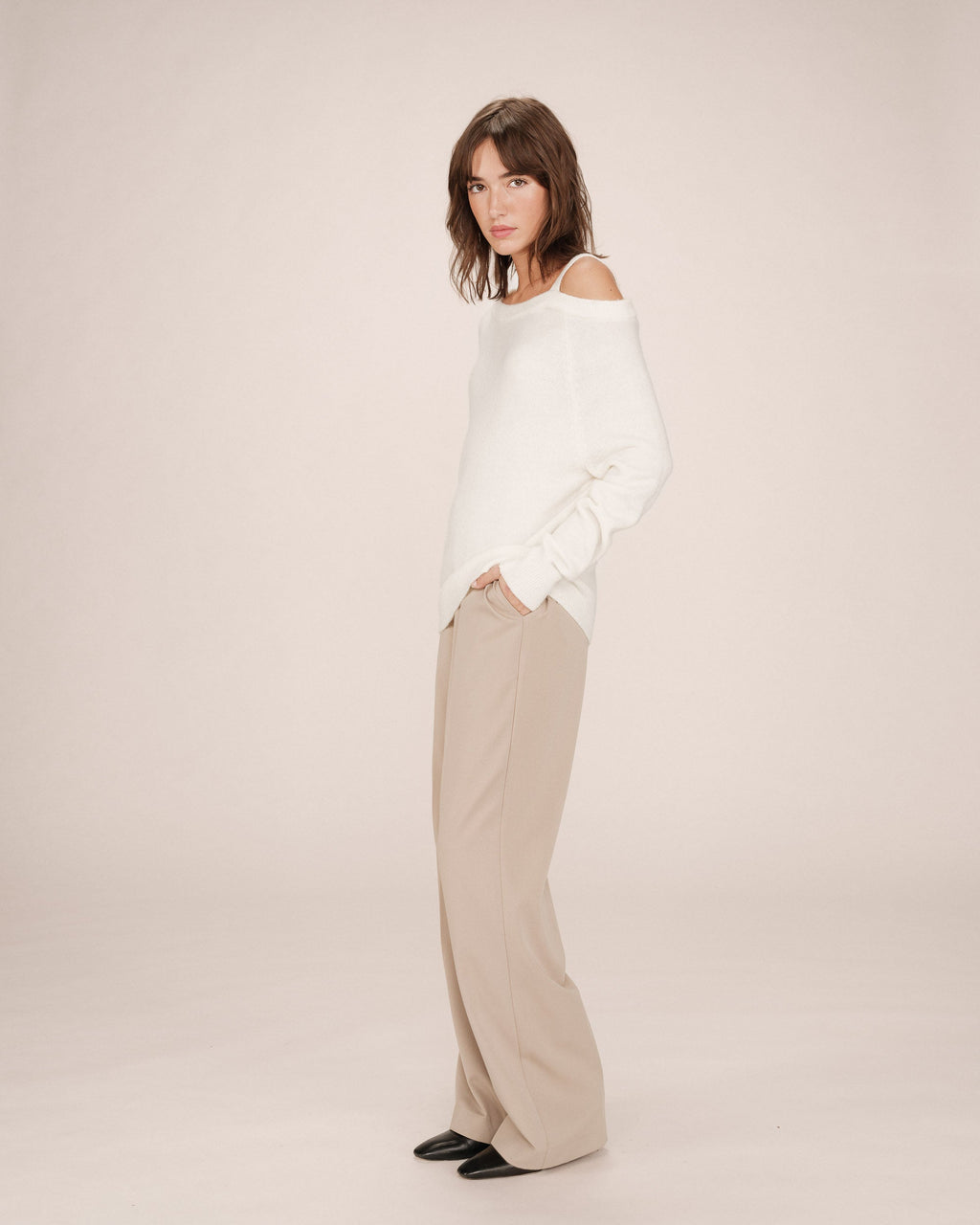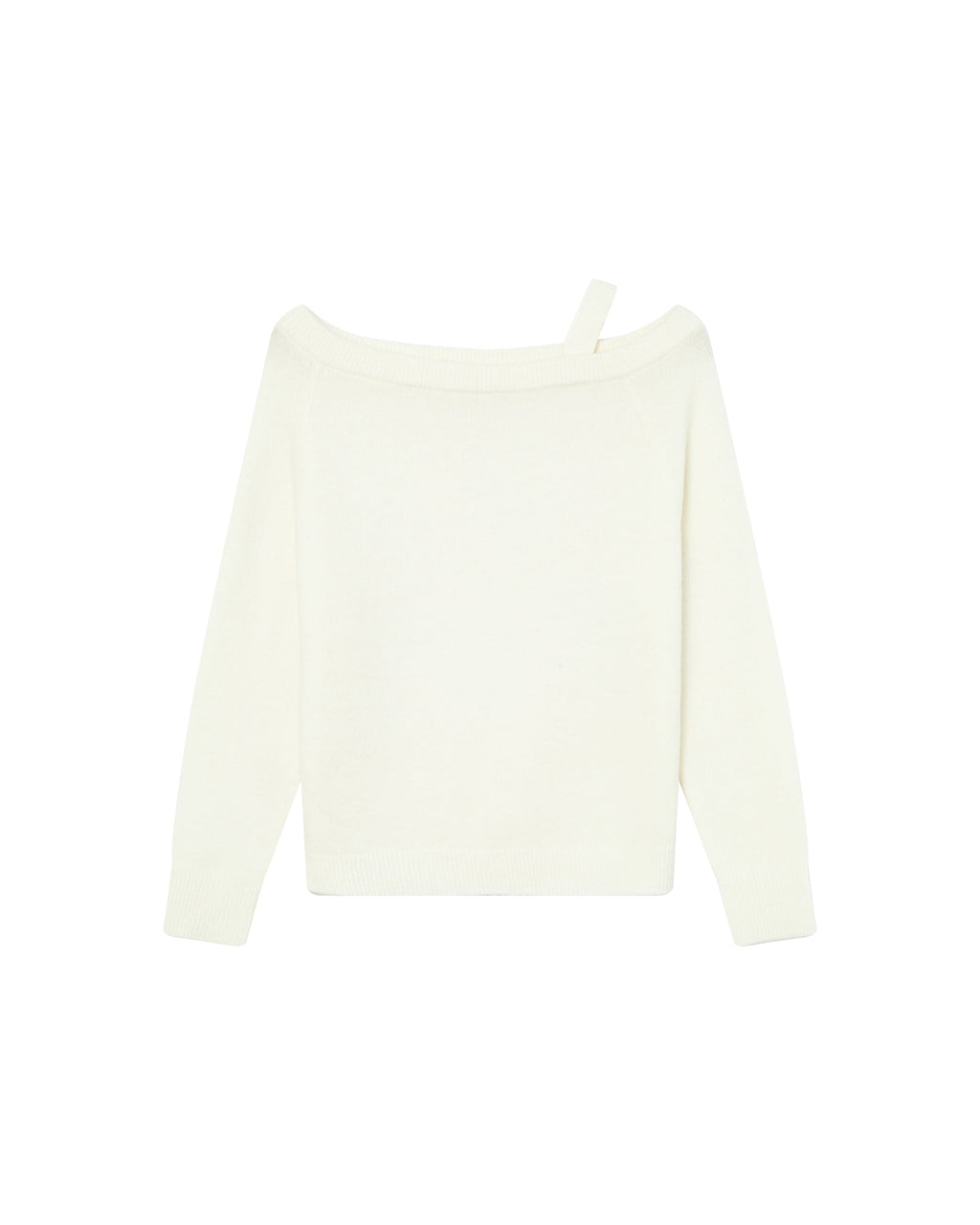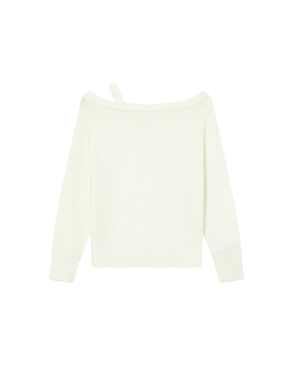 SAMANTHA_FW2517151_IVOIRE With its asymmetrical design, the SAMANTHA off-shoulder sweater is a bold piece that creates a feminine and modern silhouette. The style elegantly reveals one shoulder with an asymmetrical neckline enhanced by a thin strap on one side. The straight cut and long sleeves of the SAMANTHA long-sleeved sweater make it a comfortable piece for a casual look with sensual details.