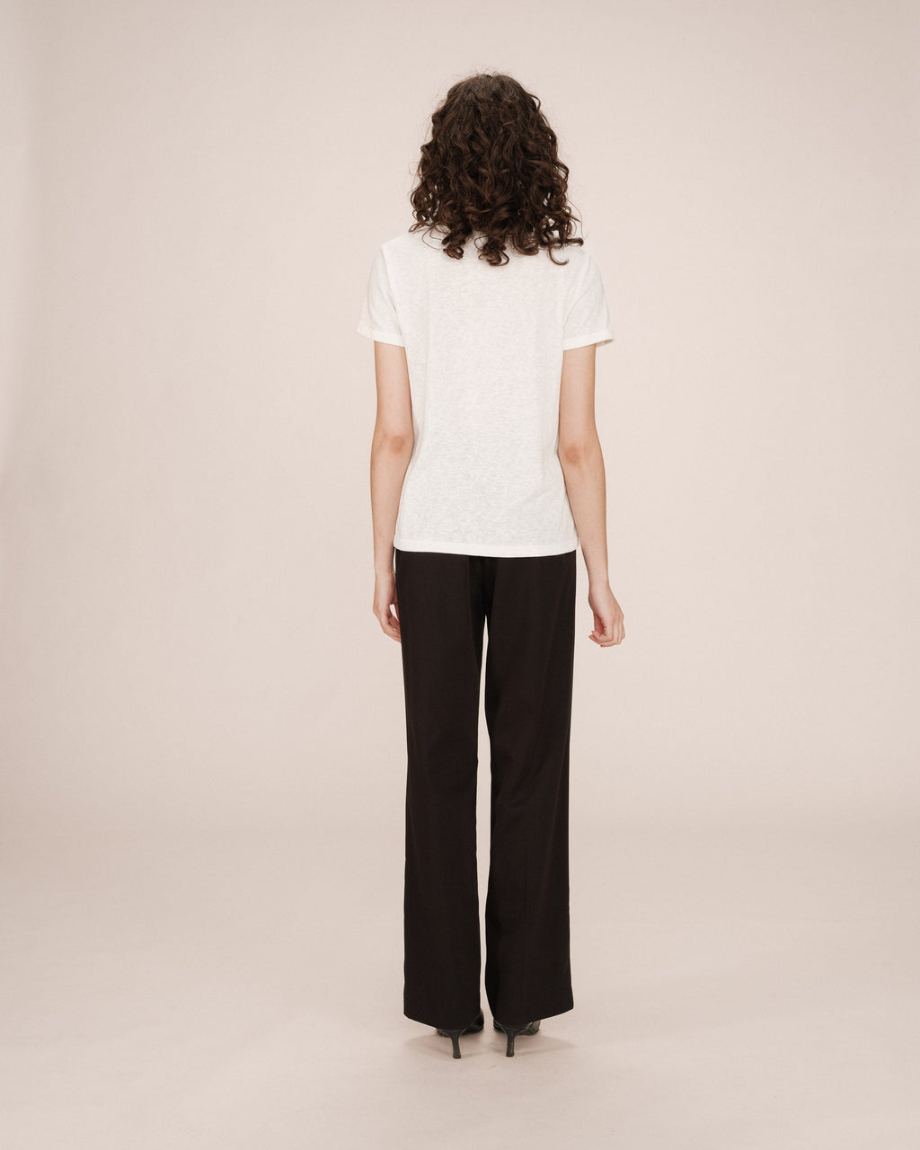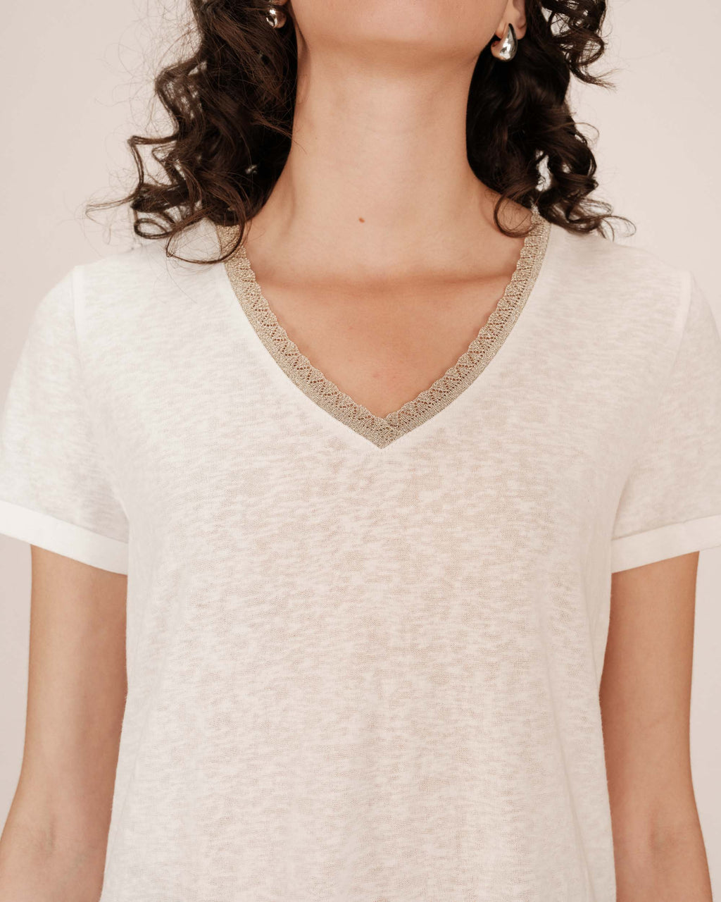 SPACE _FW2517078_IVOIRE The SPACE short-sleeved T-shirt is enhanced with a lurex trim at the V-neckline, beautifully highlighting the neckline. The SPACE V-neck T-shirt features short sleeves and a straight fit, making it one of the collection's wardrobe staples. This piece is made from natural fibres.