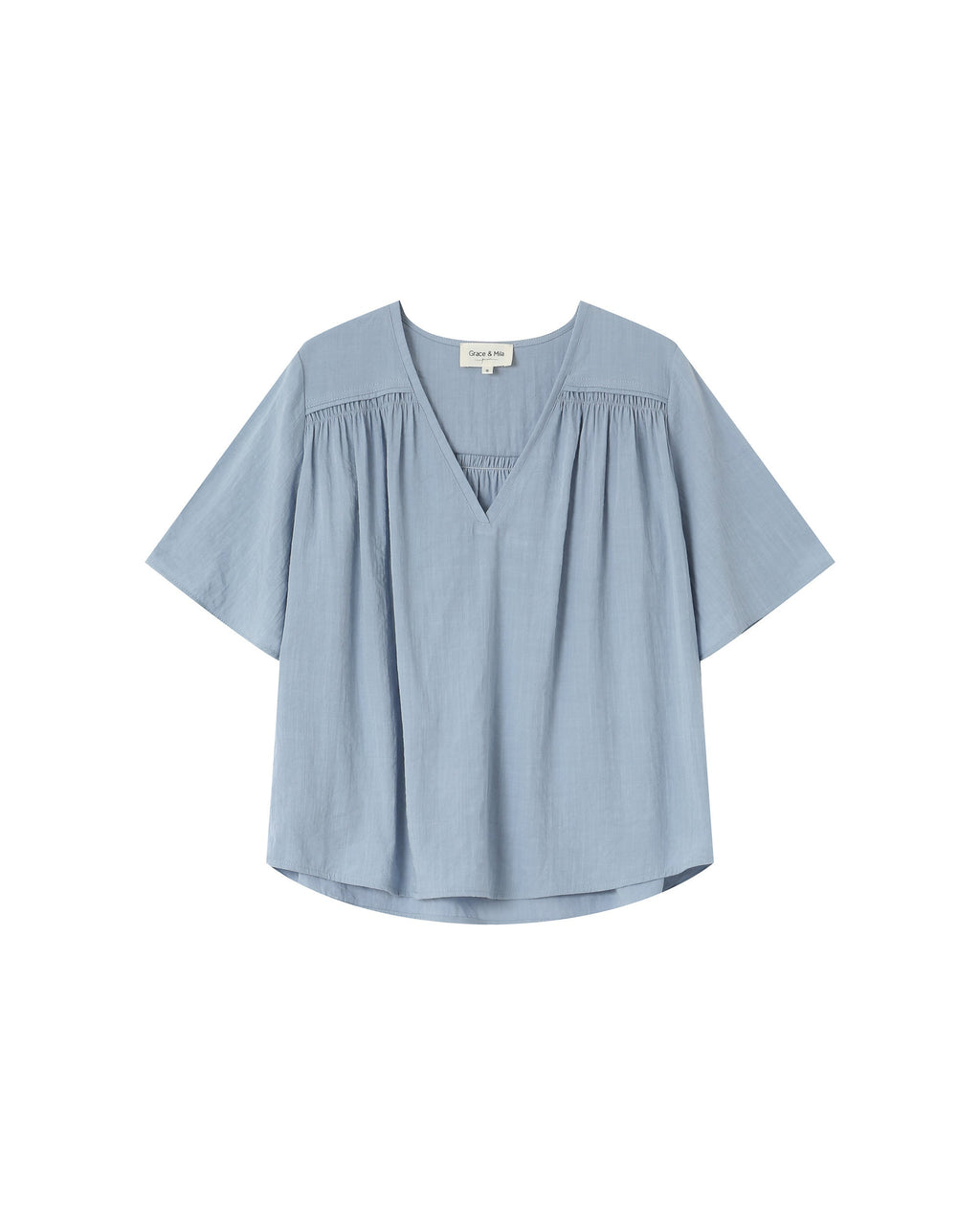 SEAGAL_FW2517142_BLEUET The SEAGAL short-sleeved top is a simple and elegant piece, perfect for everyday wear. Details such as butterfly sleeves and gathers on the front make it a feminine and sophisticated garment. The SEAGAL short-sleeved top features a V-neckline and a straight cut that flatters the feminine figure.