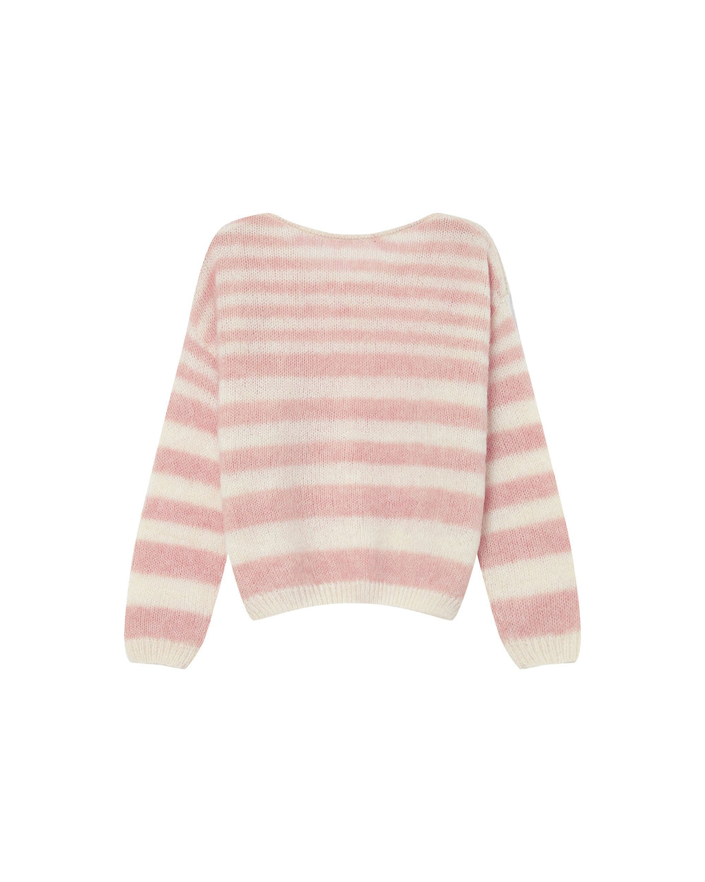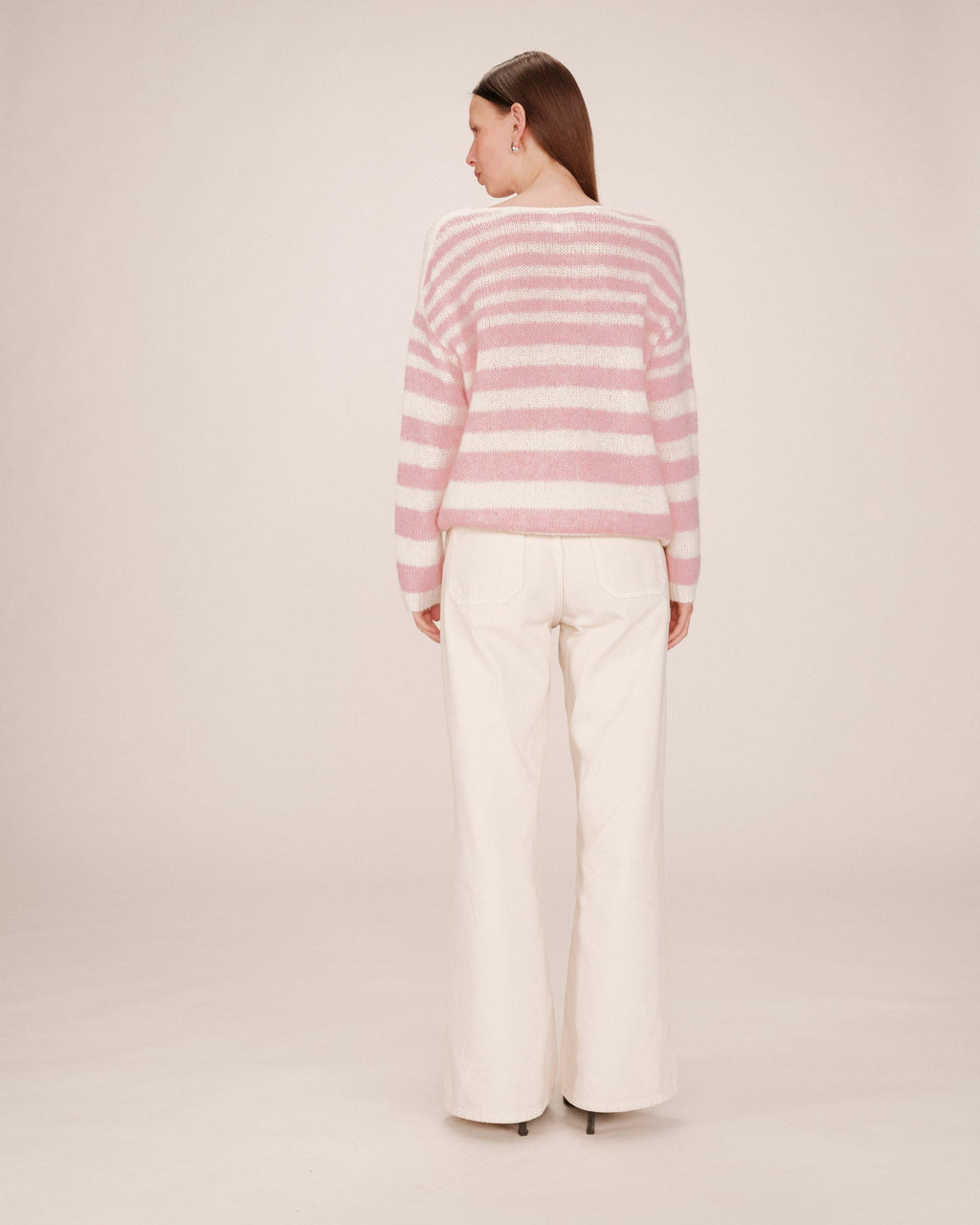 SAND_FW2517071_CRISTAL ROSE Knitted in a wool and alpaca blend yarn, the SAND striped jumper is a warm and soft piece from the collection. The long sleeves and boat neckline create an effortless and relaxed silhouette. The classic cut of the SAND wool jumper is elevated by stripes and a heart embroidery on the front.