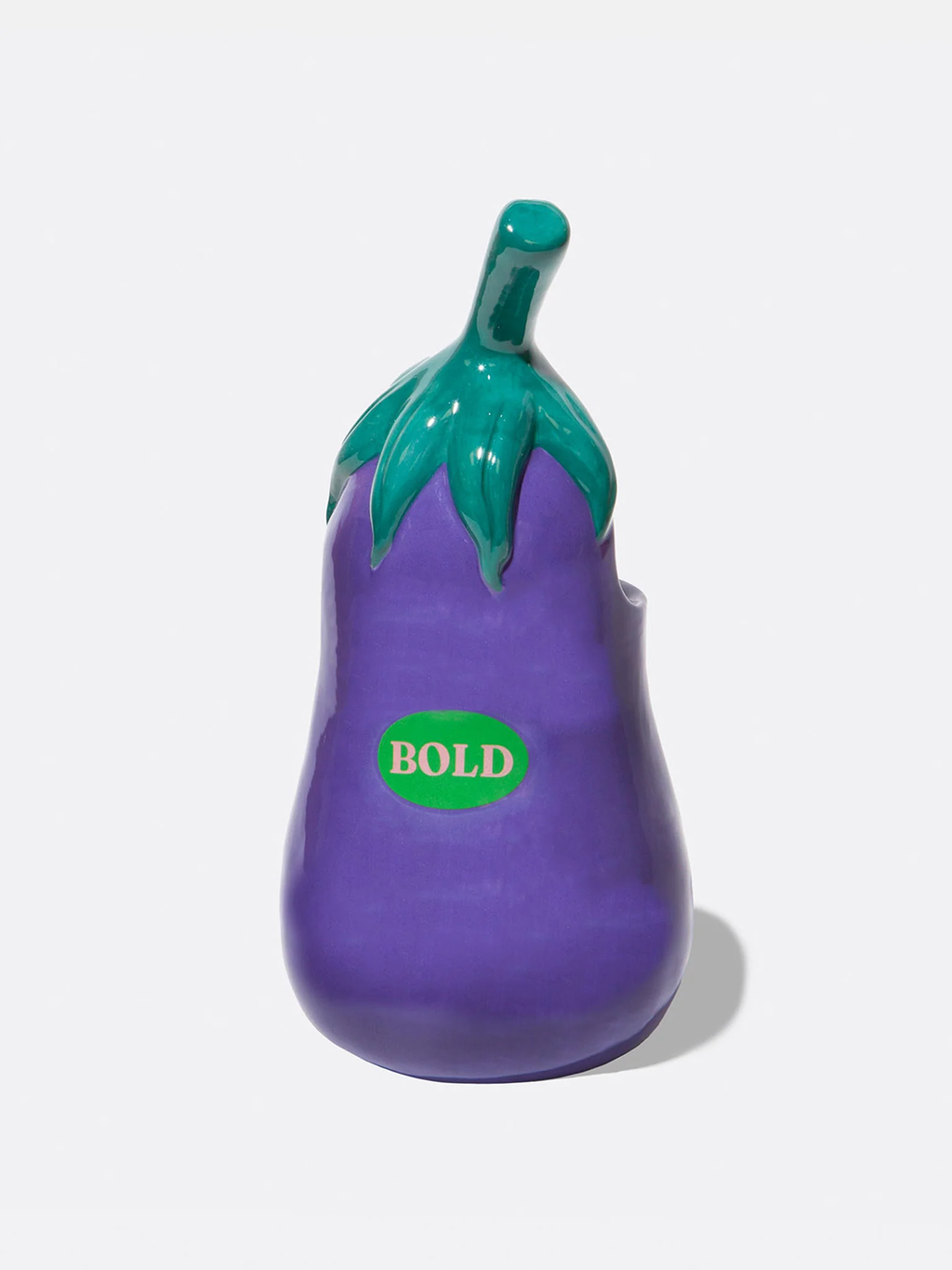 A ceramic utensil pot, shaped like an eggplant, radiates the vibrant, organic allure reminiscent of a lively farmer's market.